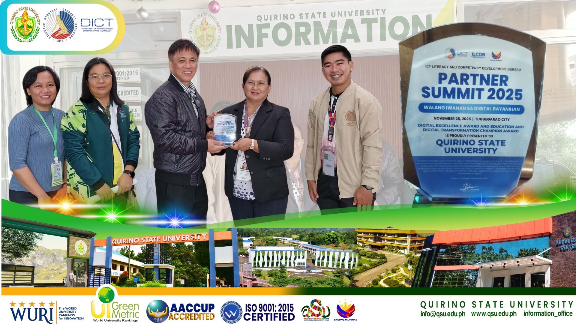 Quirino State University welcomed officials from the Department of Information and Communications Technology (DICT) โ Quirino today, January 15, 2026 for the formal awarding of the Digital Excellence Award and the Education and Digital Transformation Award to the institution for its outstanding initiatives. Ms. Virginia C. Baculi, DICT Provincial Officer, and Mr. Exen Bantiyan Claro, continue reading : ๐๐๐ ๐ก๐จ๐ง๐จ๐ซ๐๐ ๐ฐ๐ข๐ญ๐ก ๐๐ฐ๐๐ซ๐๐ฌ ๐๐จ๐ซ ๐๐ฑ๐๐๐ฅ๐ฅ๐๐ง๐๐ ๐ข๐ง ๐๐ข๐ ๐ข๐ญ๐๐ฅ ๐๐๐ฎ๐๐๐ญ๐ข๐จ๐ง ๐๐ง๐ ๐ญ๐ซ๐๐ง๐ฌ๐๐จ๐ซ๐ฆ๐๐ญ๐ข๐จ๐ง