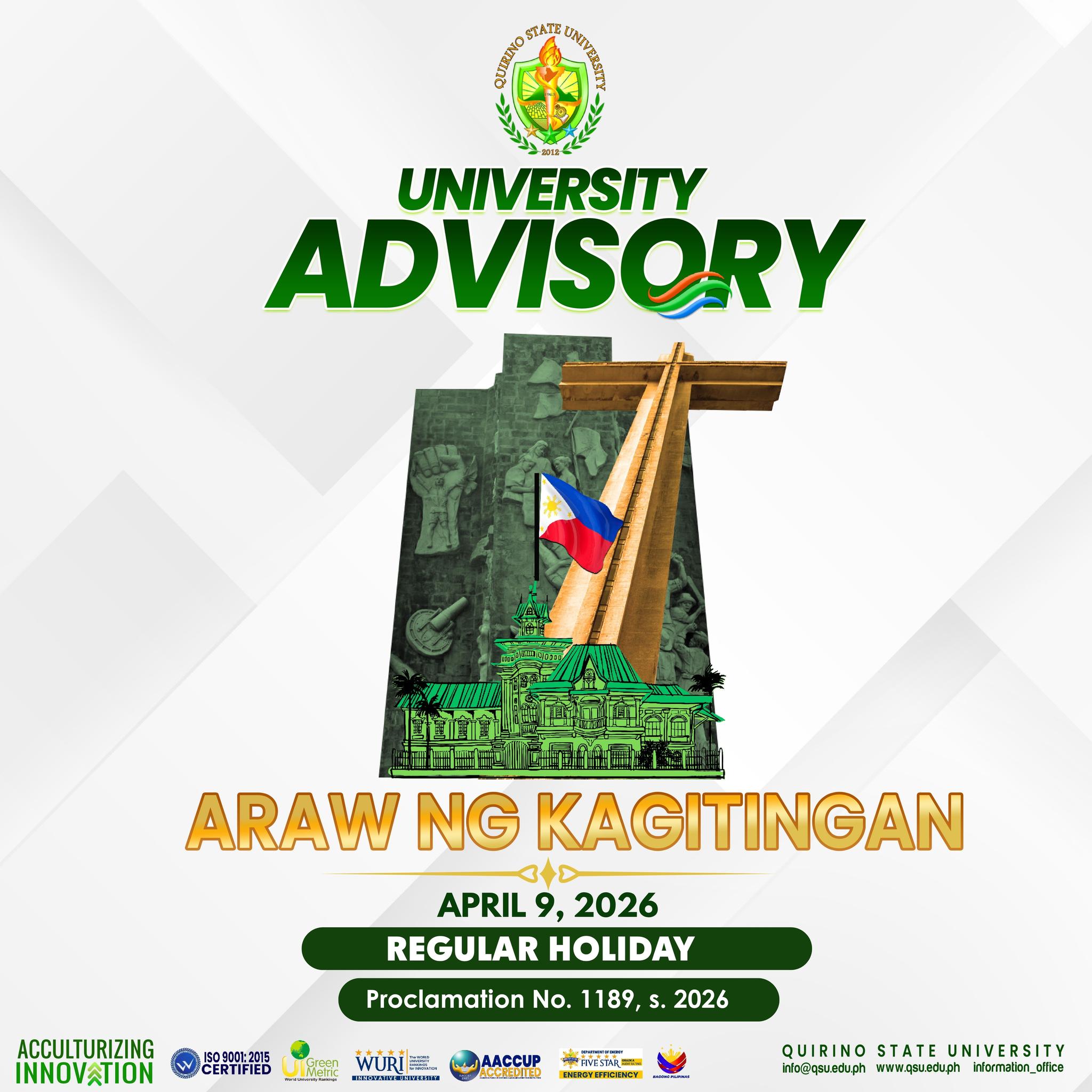 In observance of Araw ng Kagitingan, Quirino State University pays tribute to the heroes whose courage defined Philippine history and secured the liberty enjoyed today. Reflecting on this legacy, Andres Bonifacio once encouraged everyone to “always desire the goodness of each other; be a model to one another in executing and fulfilling one’s duty.” This continue reading : 𝐐𝐒𝐔 𝐜𝐞𝐥𝐞𝐛𝐫𝐚𝐭𝐞𝐬 𝐀𝐫𝐚𝐰 𝐧𝐠 𝐊𝐚𝐠𝐢𝐭𝐢𝐧𝐠𝐚𝐧 (𝐃𝐚𝐲 𝐨𝐟 𝐕𝐚𝐥𝐨𝐫