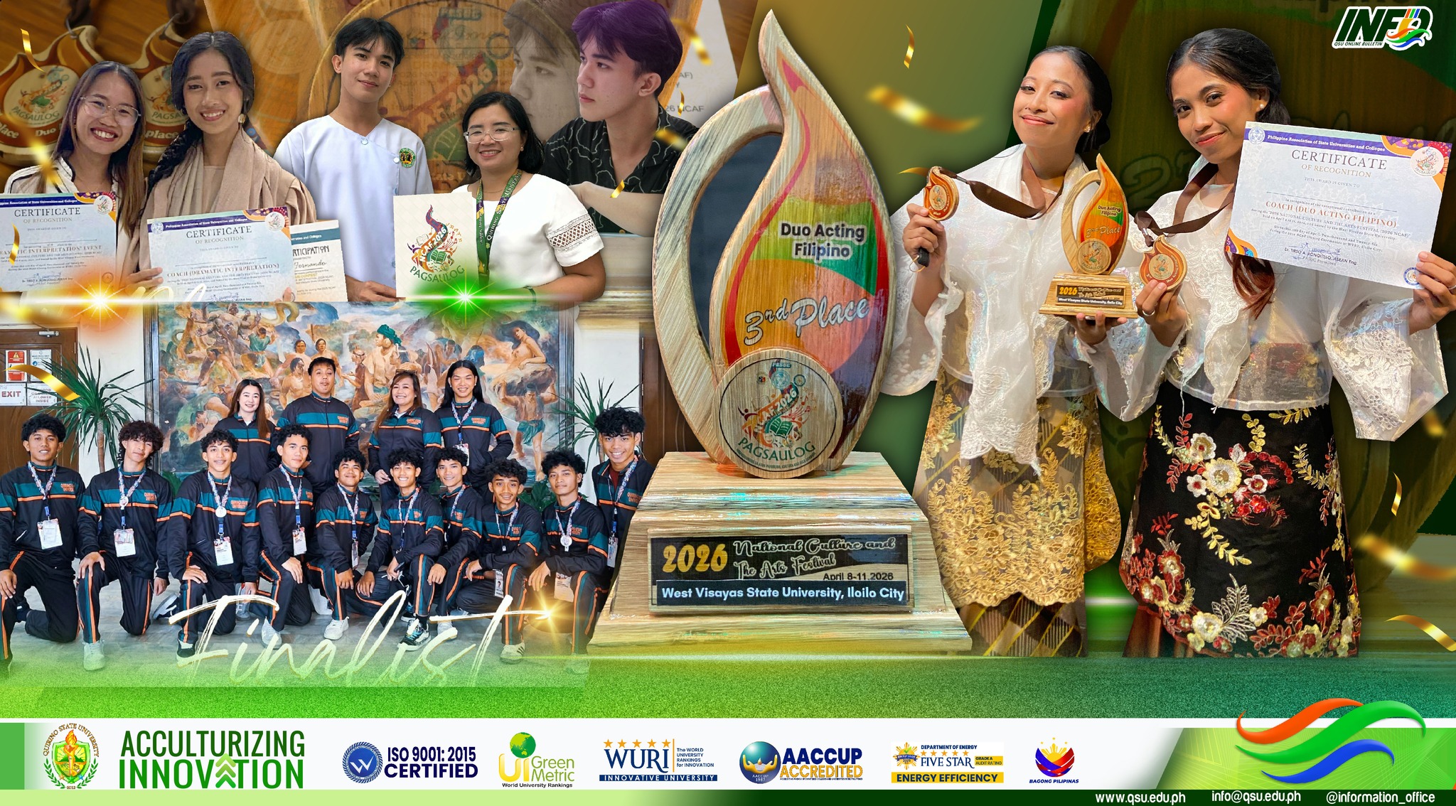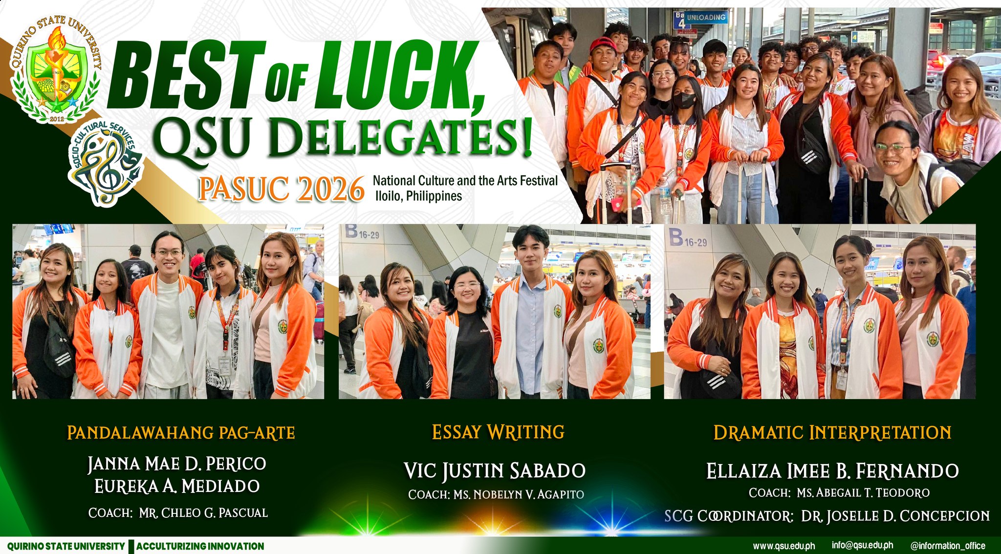 Dr. Alfonso R. Simon, OIC-President, warmly welcomed the delegates of the PASUC National Culture and the Arts Festival 2026, to his office today, April 15 at the JAA Building, Diffun Campus. The University proudly celebrates the following national placements achieved by our delegates: 3𝒓𝒅 𝑷𝒍𝒂𝒄𝒆 | 𝑷𝒂𝒏𝒅𝒂𝒍𝒂𝒘𝒂𝒉𝒂𝒏𝒈 𝑷𝒂𝒈-𝑨𝒓𝒕𝒆 Student Artists: Eureka Mediado and Janna Mae continue reading : 𝐐𝐒𝐔 𝐝𝐞𝐥𝐞𝐠𝐚𝐭𝐞𝐬 𝐩𝐚𝐲 𝐜𝐨𝐮𝐫𝐭𝐞𝐬𝐲 𝐯𝐢𝐬𝐢𝐭 𝐭𝐨 𝐎𝐈𝐂-𝐏𝐫𝐞𝐬𝐢𝐝𝐞𝐧𝐭 𝐒𝐢𝐦𝐨𝐧