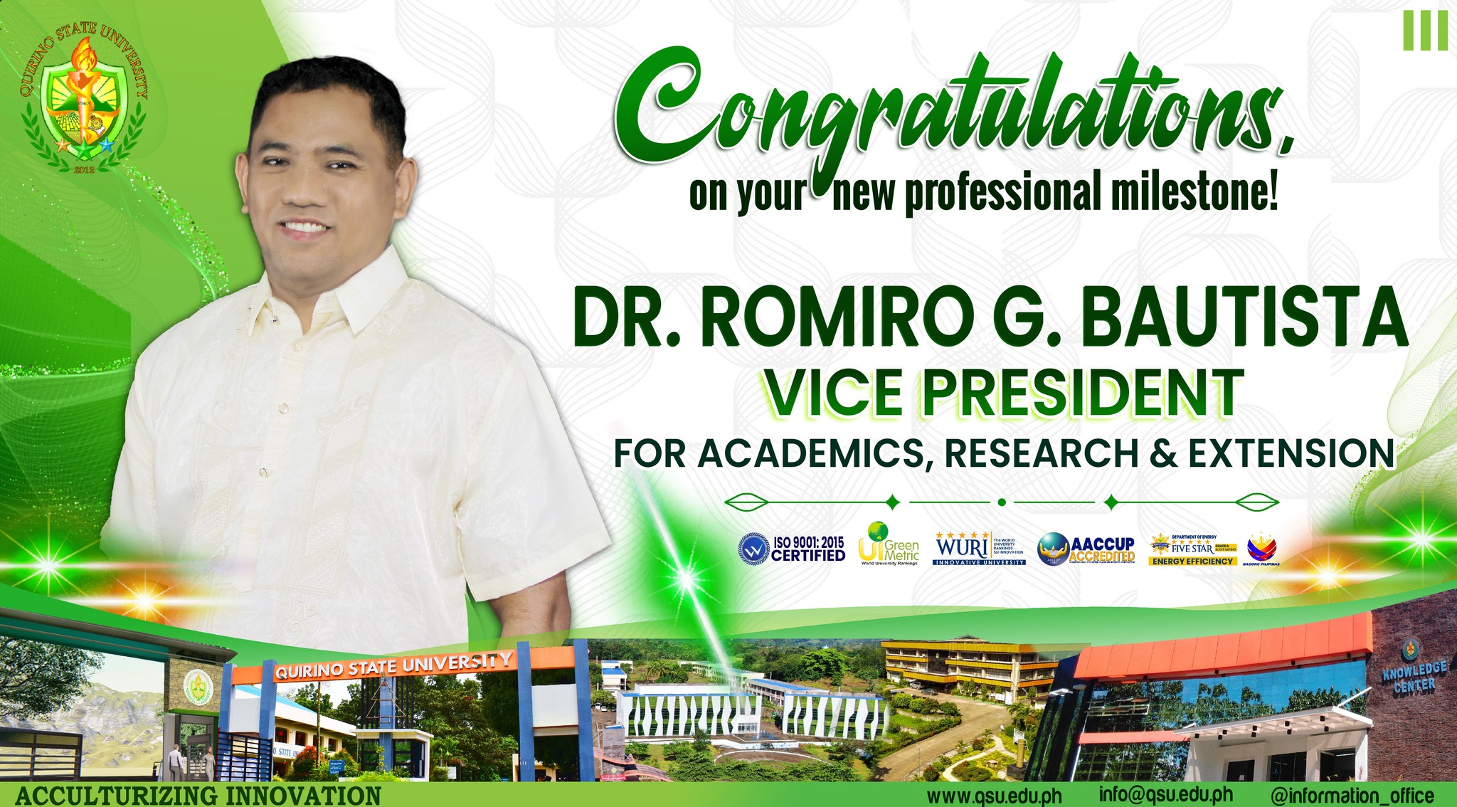 The University is pleased to announce the formal designation of Dr. Romiro G. Bautista as the new Vice President for Academics, Research, and Extension (VP-ARE). The designation was formalized via Special Order No. 04-13-(01), Series of 2026, issued by Dr. Alfonso R. Simon, OIC-President, following the approval of the Board of Regents under QSU Board continue reading : 𝐃𝐫. 𝐑𝐨𝐦𝐢𝐫𝐨 𝐆. 𝐁𝐚𝐮𝐭𝐢𝐬𝐭𝐚 𝐭𝐚𝐤𝐞𝐬 𝐡𝐞𝐥𝐦 𝐚𝐬 𝐐𝐒𝐔’𝐬 𝐕𝐢𝐜𝐞 𝐏𝐫𝐞𝐬𝐢𝐝𝐞𝐧𝐭-𝐀𝐑𝐄