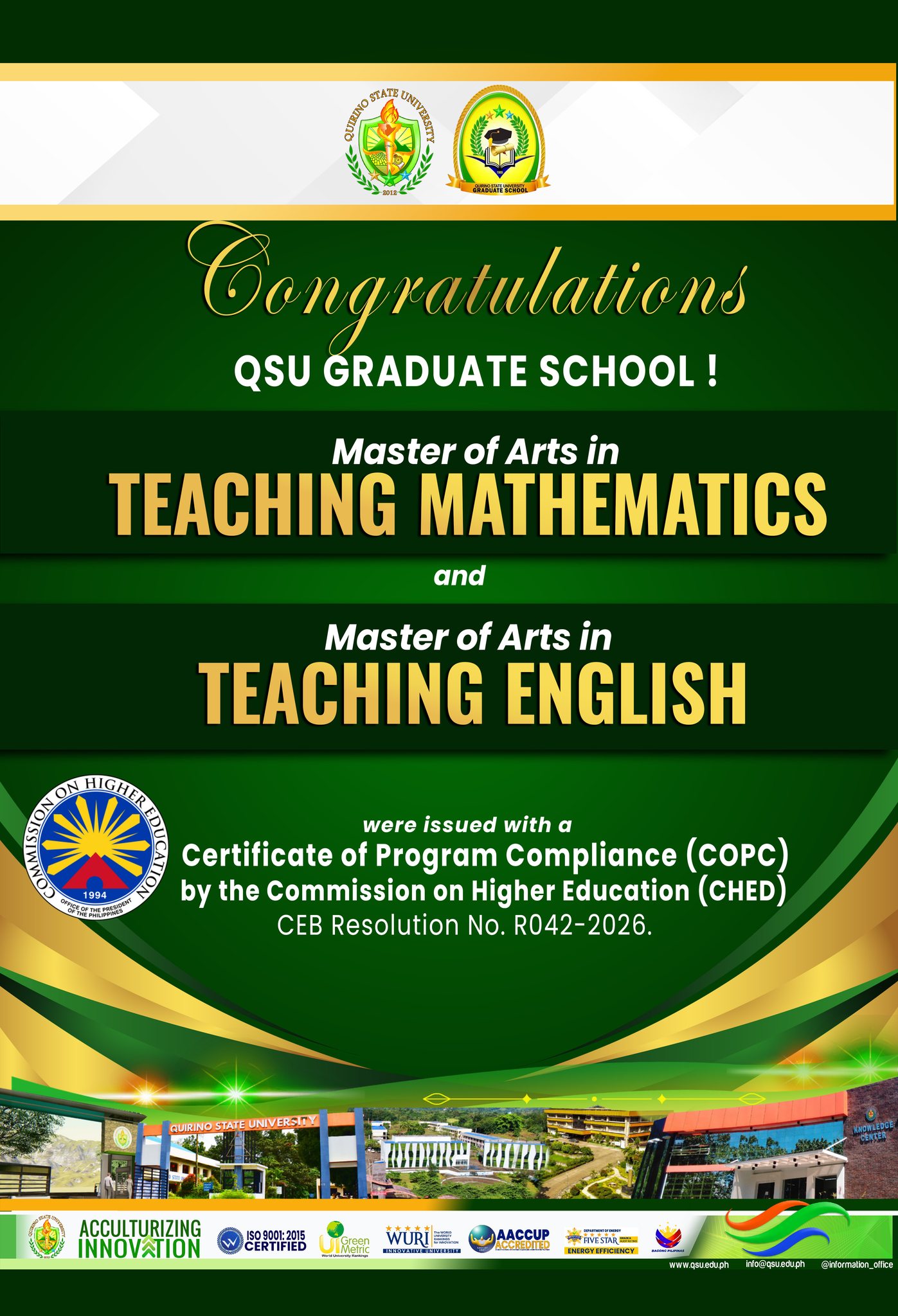 Marking a new era of academic excellence in the province, the Commission on Higher Education (CHED) Regional Office II has officially approved the issuance of the Certificate of Program Compliance (COPC) to the University’s Master of Arts in Teaching Mathematics (MAT-Math) and Master of Arts in Teaching English (MAT-English). This development comes after a thorough continue reading : 𝐐𝐒𝐔’𝐬 𝟐 𝐠𝐫𝐚𝐝𝐮𝐚𝐭𝐞 𝐬𝐜𝐡𝐨𝐨𝐥 𝐩𝐫𝐨𝐠𝐫𝐚𝐦𝐬 𝐚𝐜𝐡𝐢𝐞𝐯𝐞 𝐜𝐨𝐯𝐞𝐭𝐞𝐝 𝐂𝐎𝐏𝐂 𝐟𝐫𝐨𝐦 𝐂𝐇𝐄𝐃