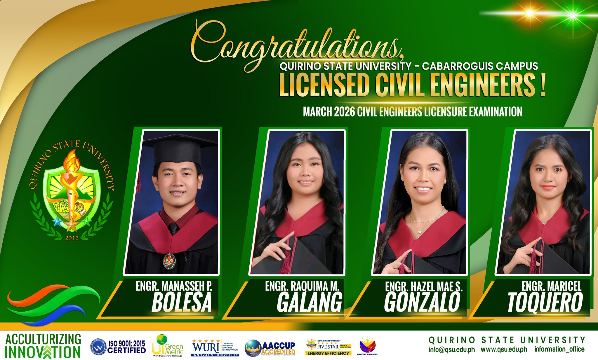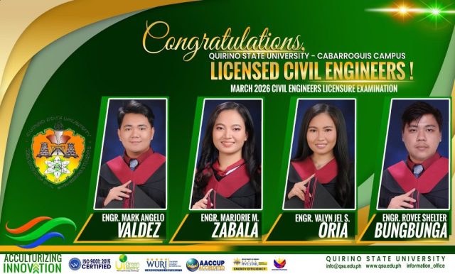 The University announces that eight of its graduates have successfully passed the March 2026 Civil Engineers Licensure Examination. Amidst a competitive national field where only 6,438 out of 18,370 examinees earned their licenses, these QSUans stood out by demonstrating exceptional technical excellence, grit, and dedication to their profession.