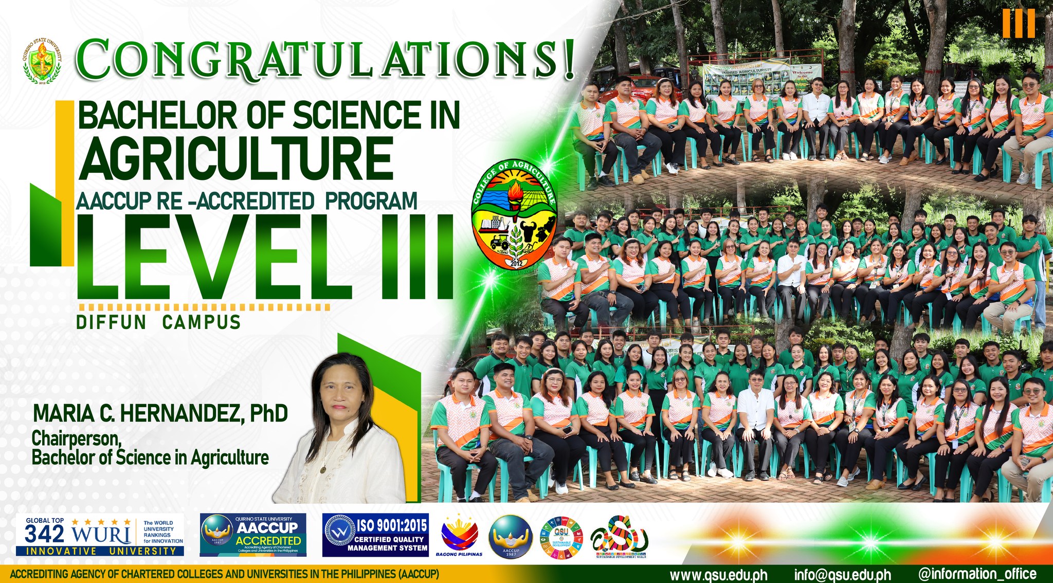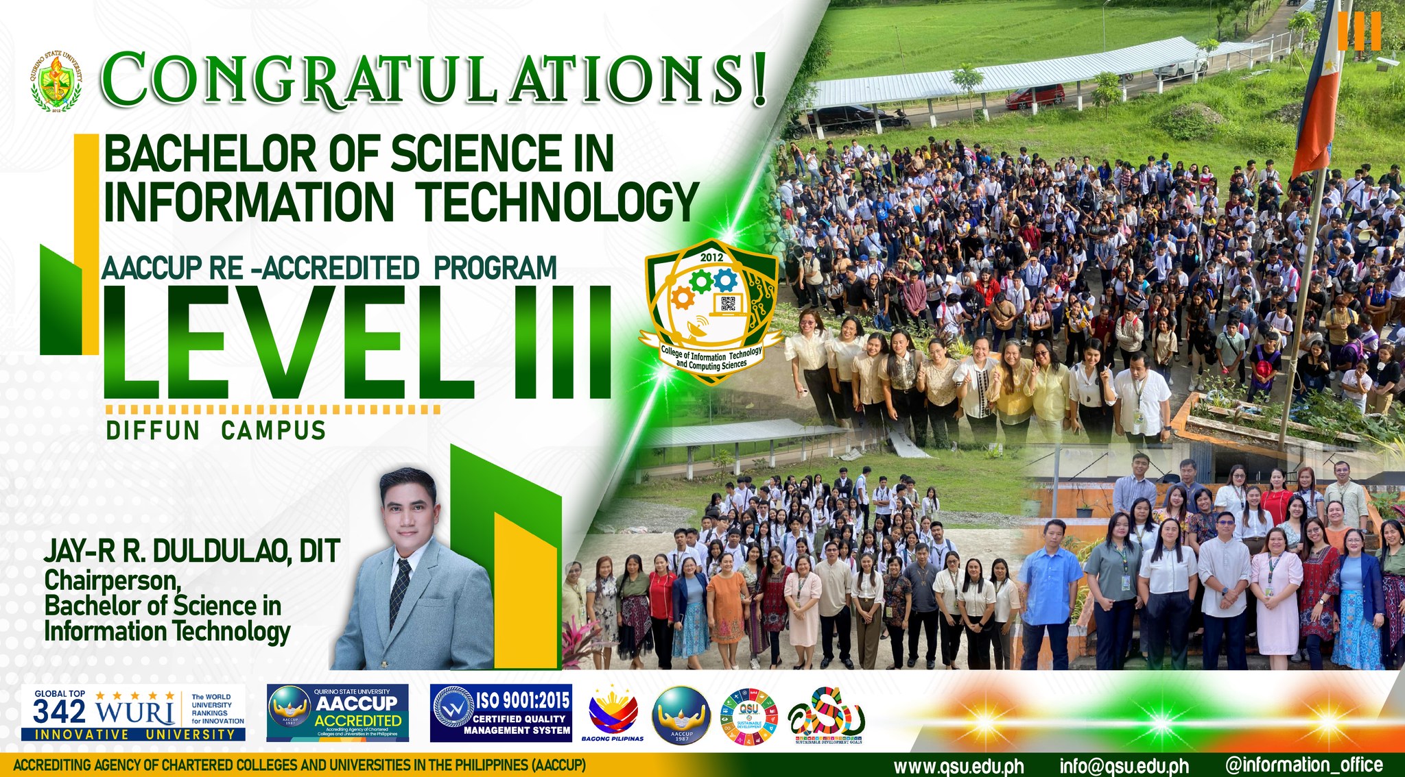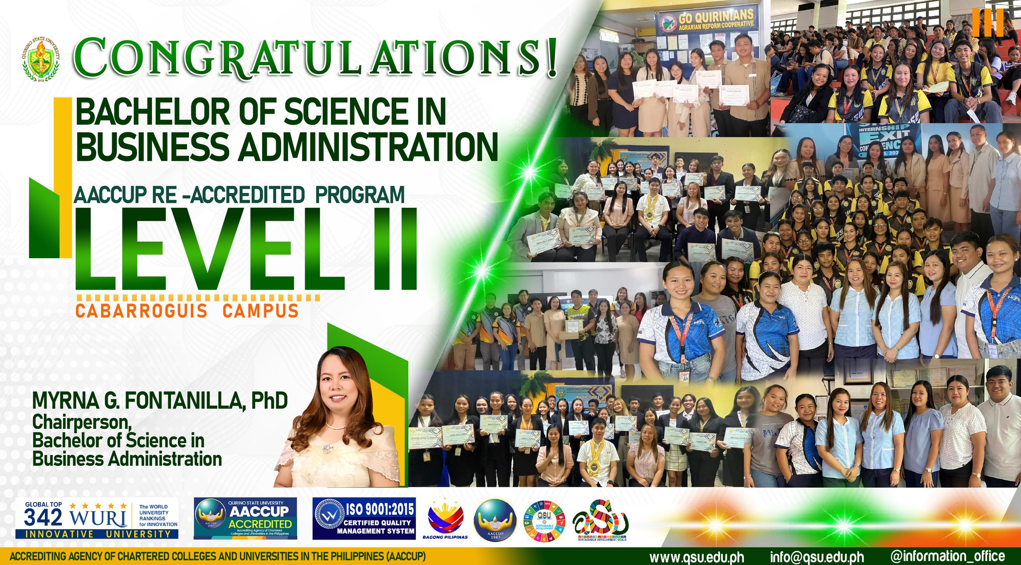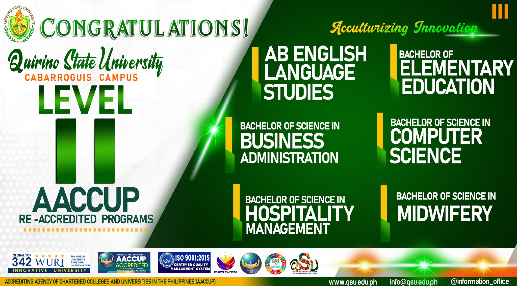 I am filled with immense pride and gratitude as we celebrate a crucial breakthrough for our institution: the successful re-accreditation of our various academic programs by the Accrediting Agency of Chartered Colleges and Universities in the Philippines (AACCUP). This achievement is a clear indication of our collective dedication to excellence and our sustained pursuit of quality education.