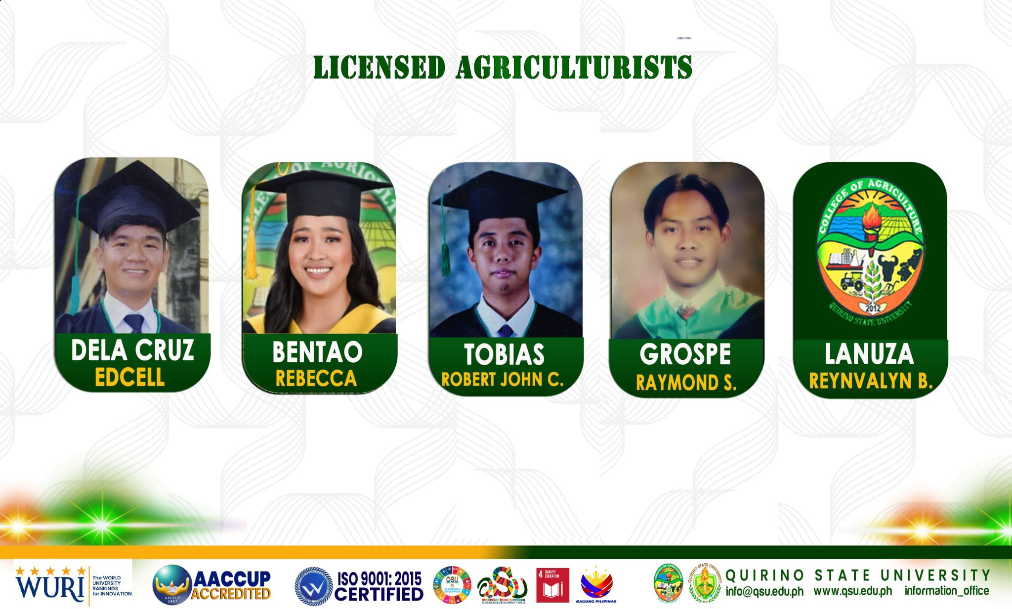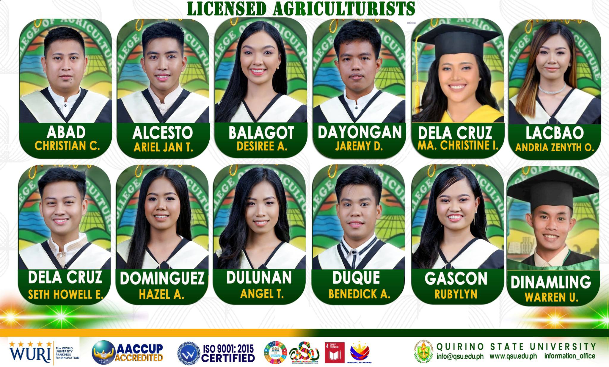 Special acknowledgment is given to the dedicated faculty members of the College of Agriculture, under the leadership of Dr. Edgar V. Benabise, Dean of the College of Agriculture, and the guidance of Program Chairpersons – Dr. Maria C. Hernandez of QSU Diffun and Mr. Dennie T. Ruma of QSU Maddela, for their concerted efforts in student mentoring and rigorous preparation.