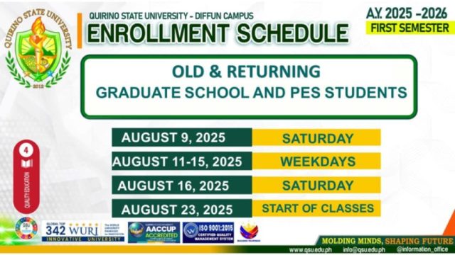 Enrollment for regular (old) and returning Graduate School students, along with those who are taking professional education subjects, begins tomorrow, August 9, 2025 (Saturday). It will resume on August 11-15, 2025.