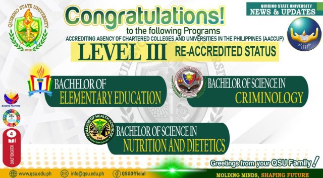 The Bachelor of Science in Nutrition and Dietetics (BSND), Bachelor of Science in Criminology (BSCrim), and Bachelor of Elementary Education (BEED) programs at Quirino State University (QSU) – Diffun Campus have achieved a significant milestone, securing Level III Re-Accredited status from the Accrediting Agency of Chartered Colleges and Universities in the Philippines, Inc. (AACCUP).