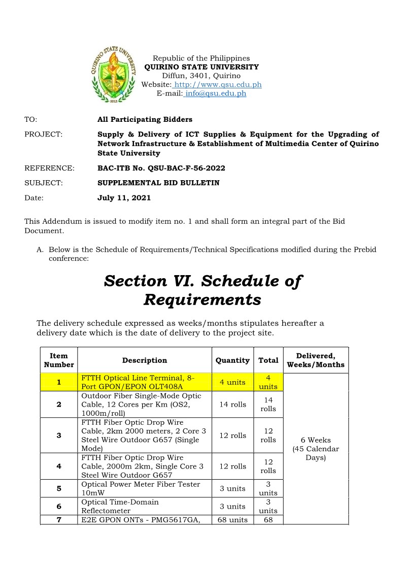 Bid Bulletin – Supply & Delivery of ICT Supplies & Equipment for the Upgrading of Network Infrastructure & Establishment of Multimedia Center of Quirino State University Posted on July 11, 2022