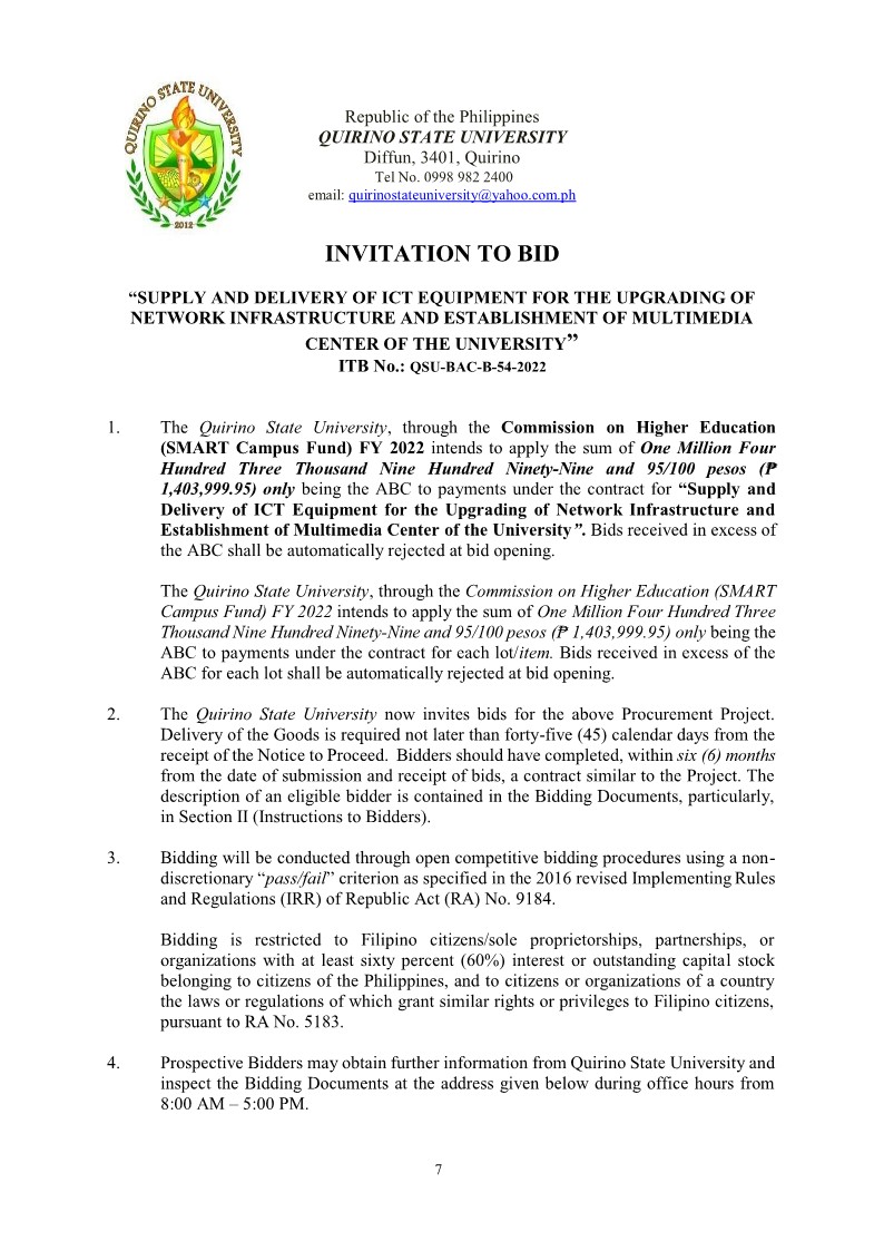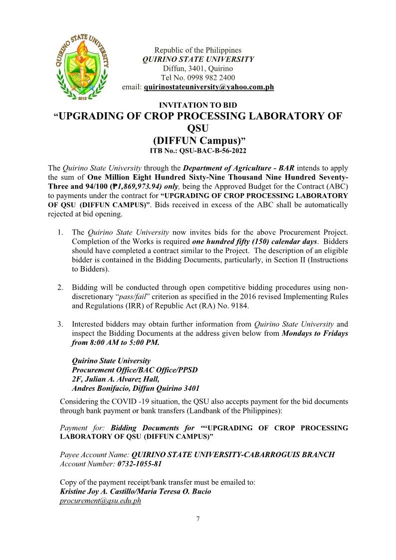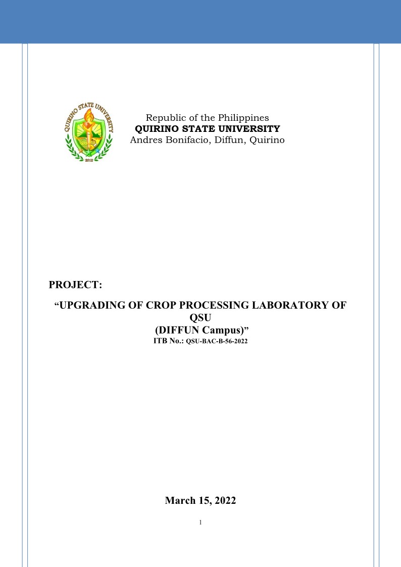 Invitation to Bid – Upgrading of Crop Processing Laboratory of QSU (Diffun Campus) Posted on February 24, 2022