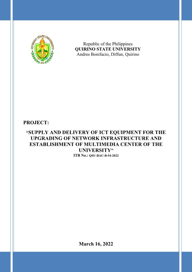 Bidding Documents – Supply and Delivery of ICT Equipment for the Upgrading of Network Infrastructure and Establishment of Multimedia Center of the University Posted on February 24, 2022