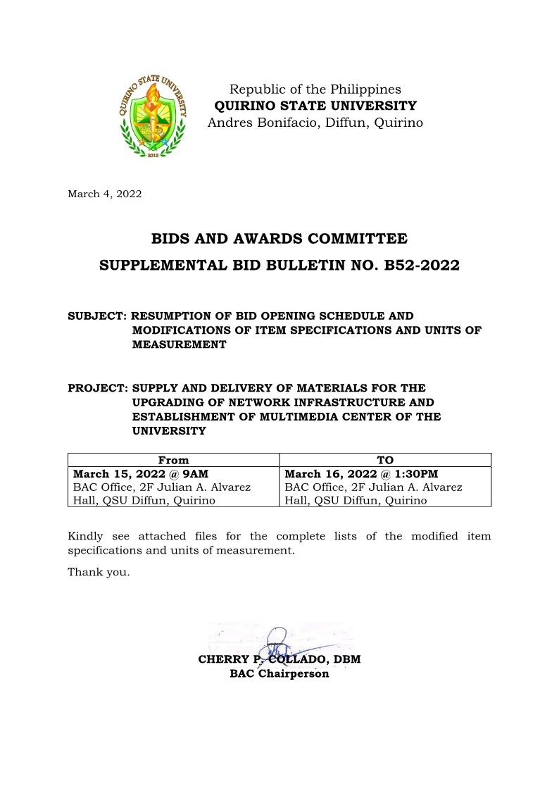 Bid Bulletin – Supply and Delivery of Materials for the Upgrading of Network Infrastructure and Establishment of Multimedia Center of the University Posted on March 4, 2022