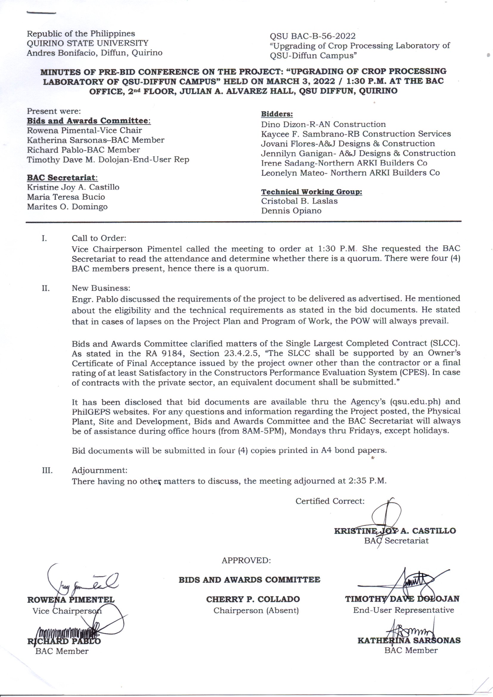 Minutes of the Meeting – Pre-Bid Conference – Upgrading of Crop Processing Laboratory of QSU (Diffun Campus) Posted on March 3, 2022