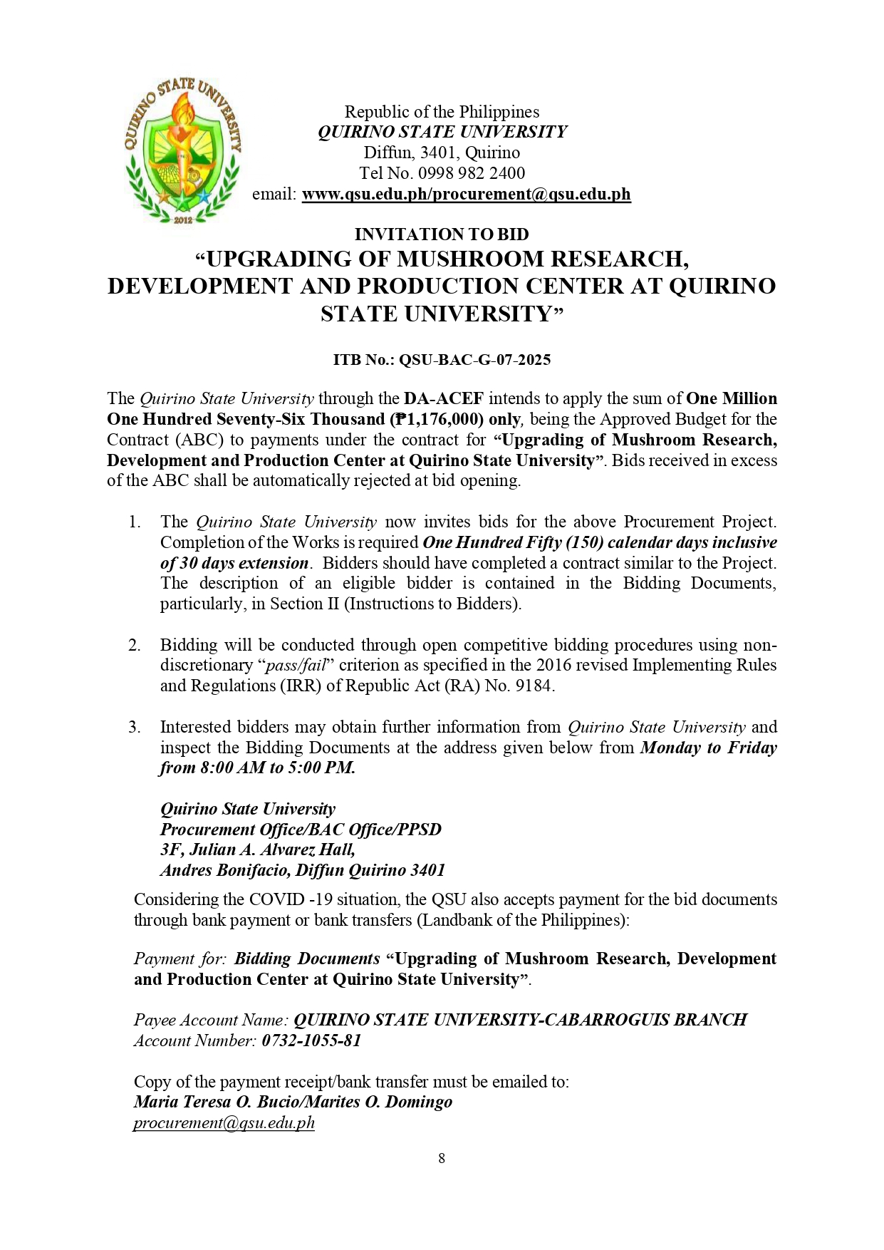 NOTICE OF AWARD FOR THE PROJECT: SUPPLY & DELIVERY OF LABORATORY EQUIPMENT FOR THE UPGRADING OF MUSHROOM RESEARCH, DEVELOPMENT AND PRODUCTION CENTER AT QUIRINO STATE UNIVERSITY Posted on September 12, 2025