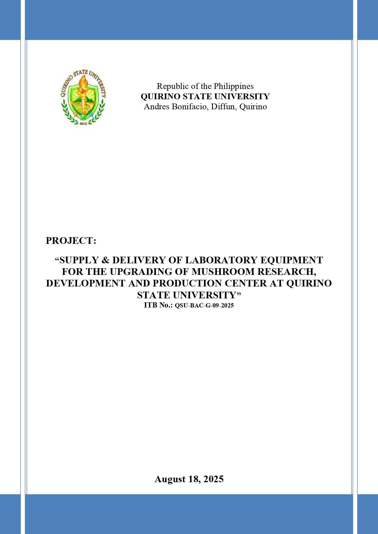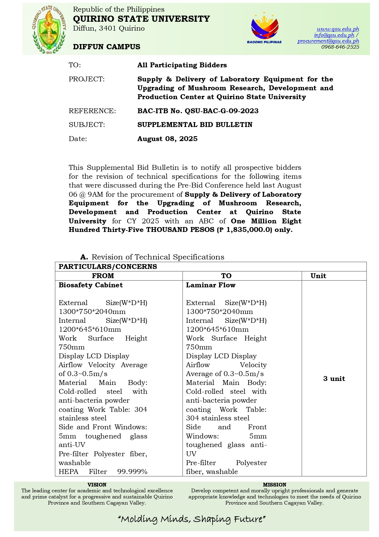 Supplemental Bid Bulletin for the project: Supply & Delivery of Laboratory Equipment for the Upgrading of Mushroom Research, Development and Production Center at Quirino State University Posted on August 8, 2025