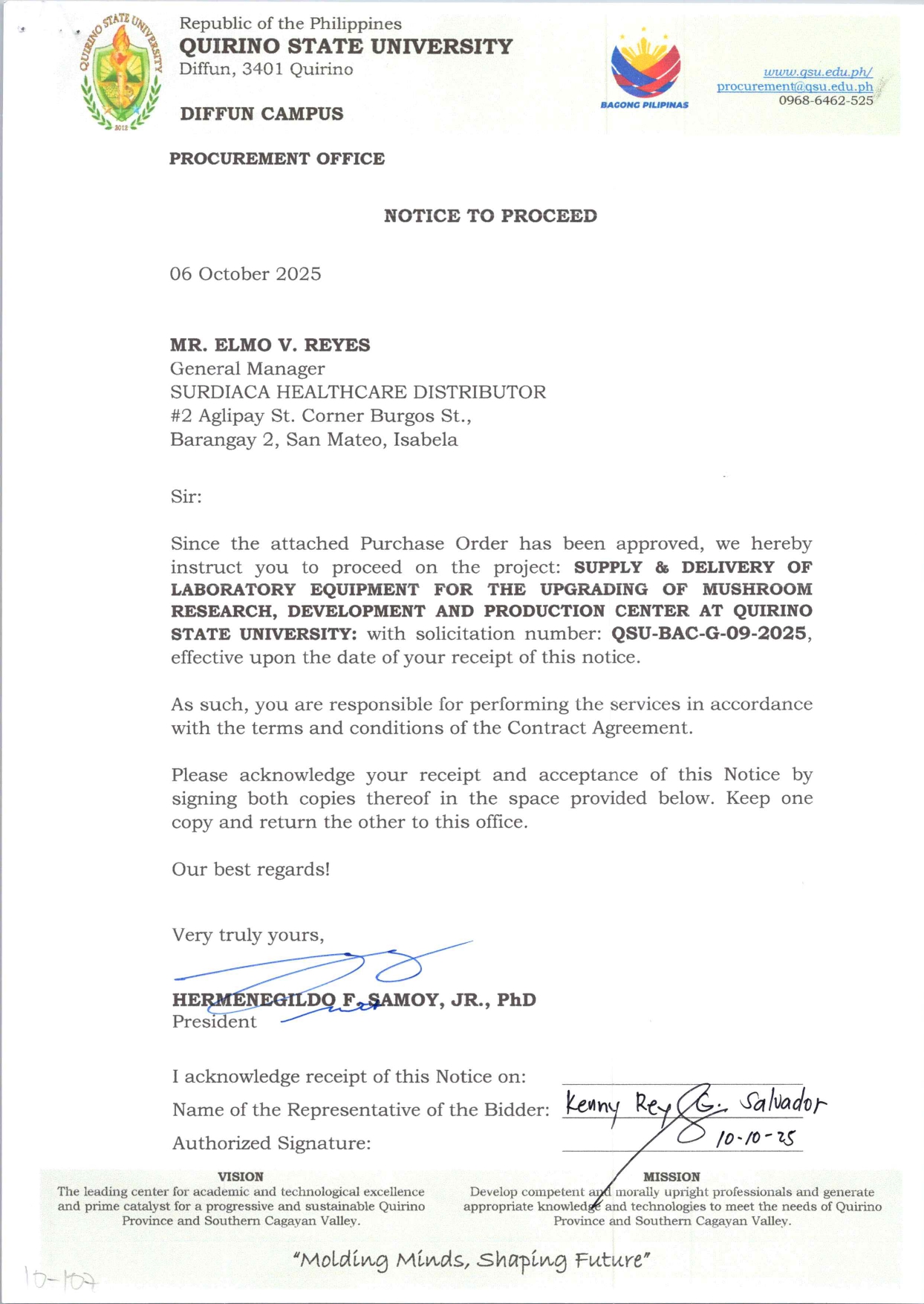 NOTICE TO PROCEED FOR THE PROJECT:SUPPLY & DELIVERY OF LABORATORY EQUIPMENT FOR THE UPGRADING OF MUSHROOM RESEARCH, DEVELOPMENT AND PRODUCTION CENTER AT QUIRINO STATE UNIVERSITY Posted on October 10, 2025