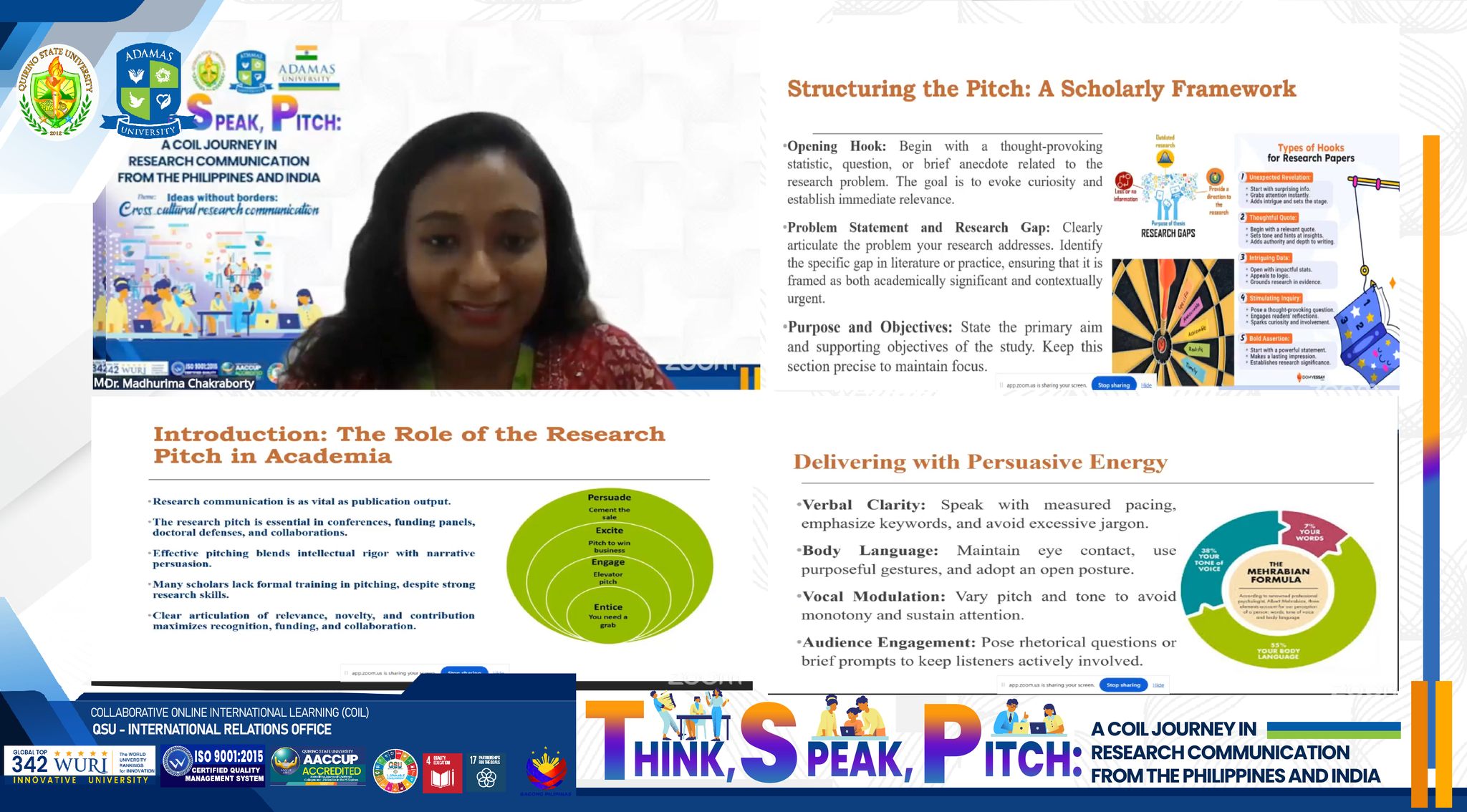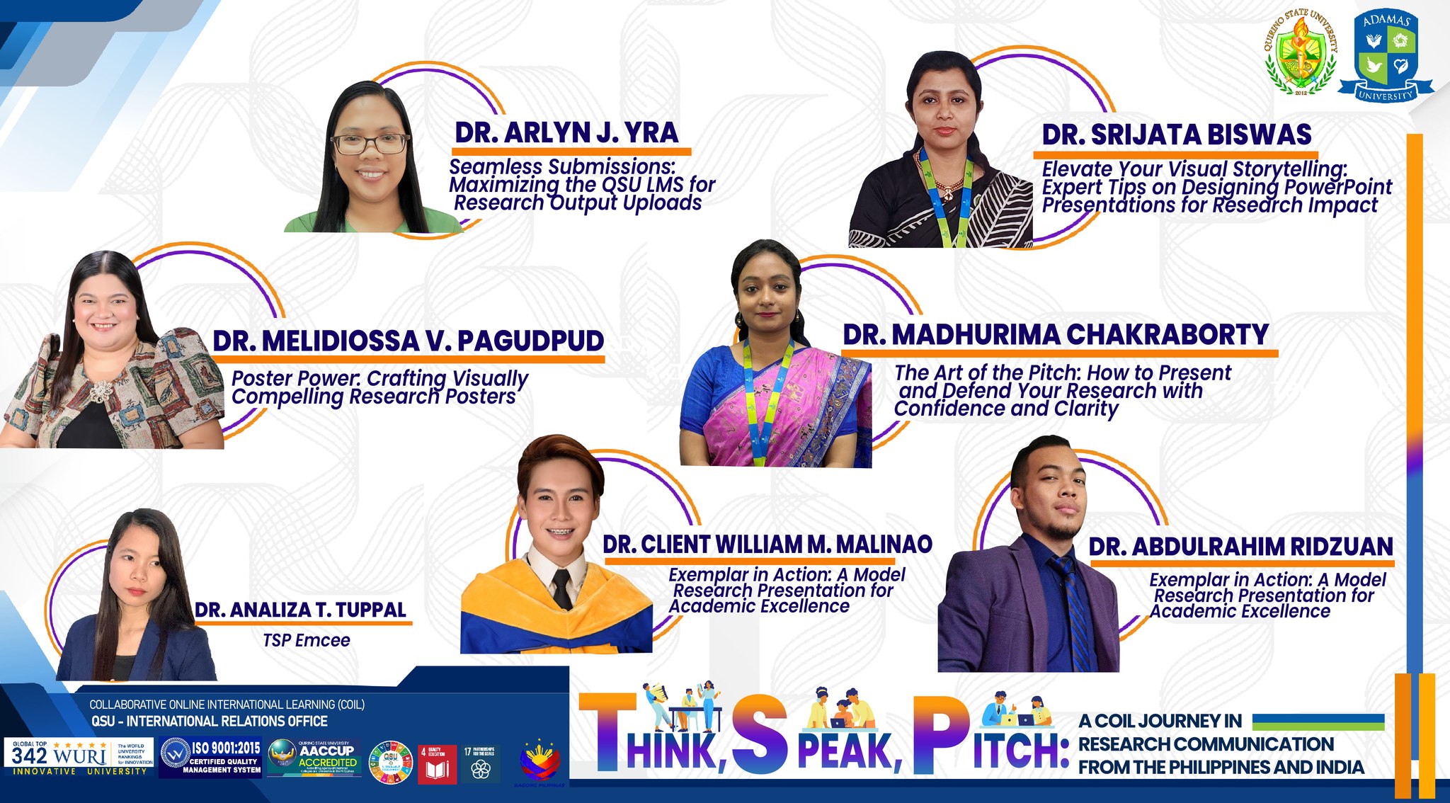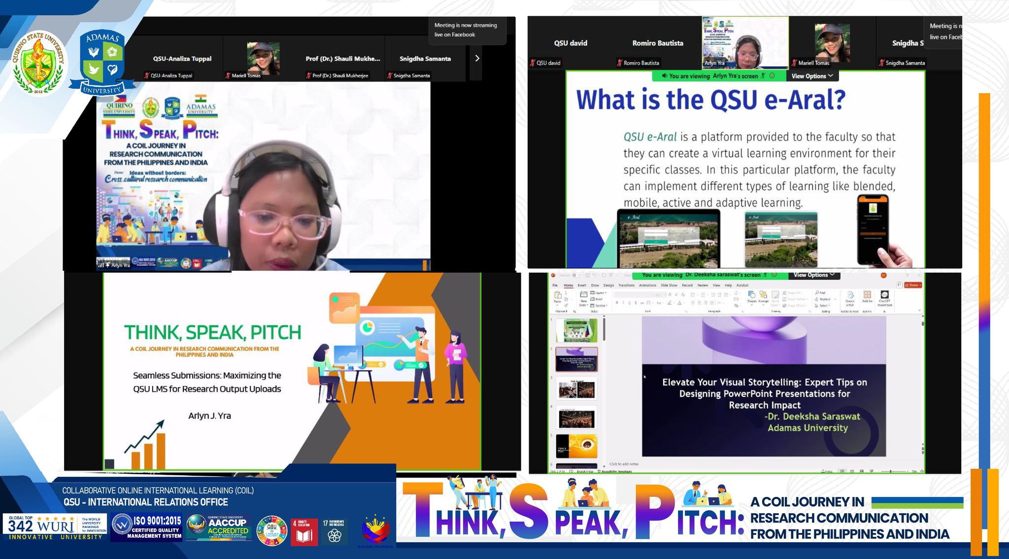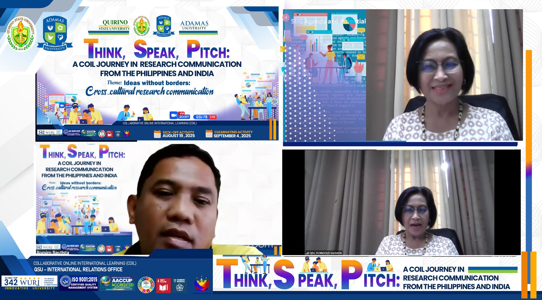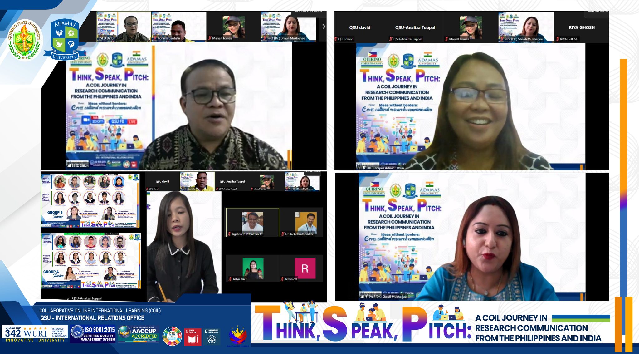 The University (QSU) and Adamas University (AU) in India officially launched the “Think, Speak, Pitch: A COIL Journey in Research Communication” program on August 19, 2025. Held via Zoom and streamed on Facebook Live, the event brought together students and faculty from both institutions for a collaborative experience designed to sharpen skills in research communication, public speaking, and and academic writing within a global context.