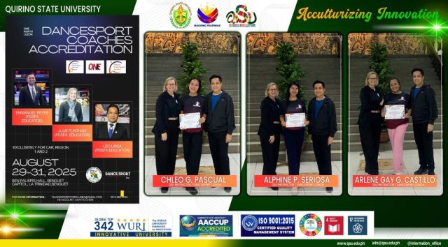 The newly accredited coaches are Ms. Arlene Gay C. Castillo and Mr. Chleo G. Pascual from Cabarroguis Campus, and Ms. Alphine P. Seriosa from Diffun Campus. The trio successfully completed and passed the Coach Level 1 theory examination for both Latin American and Modern Standard DanceSport. The accreditation cum congress was held from August 29-31, 2025, at the Ben Palispis Hall in the Benguet Capitol Gym, La Trinidad, Benguet. The event was organized by the One North Luzon Chapter in partnership with the Philippine Dance Sport Federation Academy.