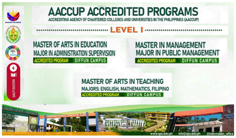 Awards and Achievements Hailed as 342 Global Top Innovative University in the 2025 and World University Rankings for Innovation (The WURI) Awarded as 2023 Most Responsive ASEAN Higher Education Institution in Region 2 AACCUP Level 1 Accredited for Master of Arts in Education (MaEd), Master in Management (MMPM), and Master of Arts in Teaching (MAT) Received the 2023 Gawad Selyo ng Kahusayan sa Wika at Kultura from the Komisyon ng Wikang Filipino Dr. Rosalyn L. Delizo was hailed as Most Outstanding Supervisor during 2023 PRAISE