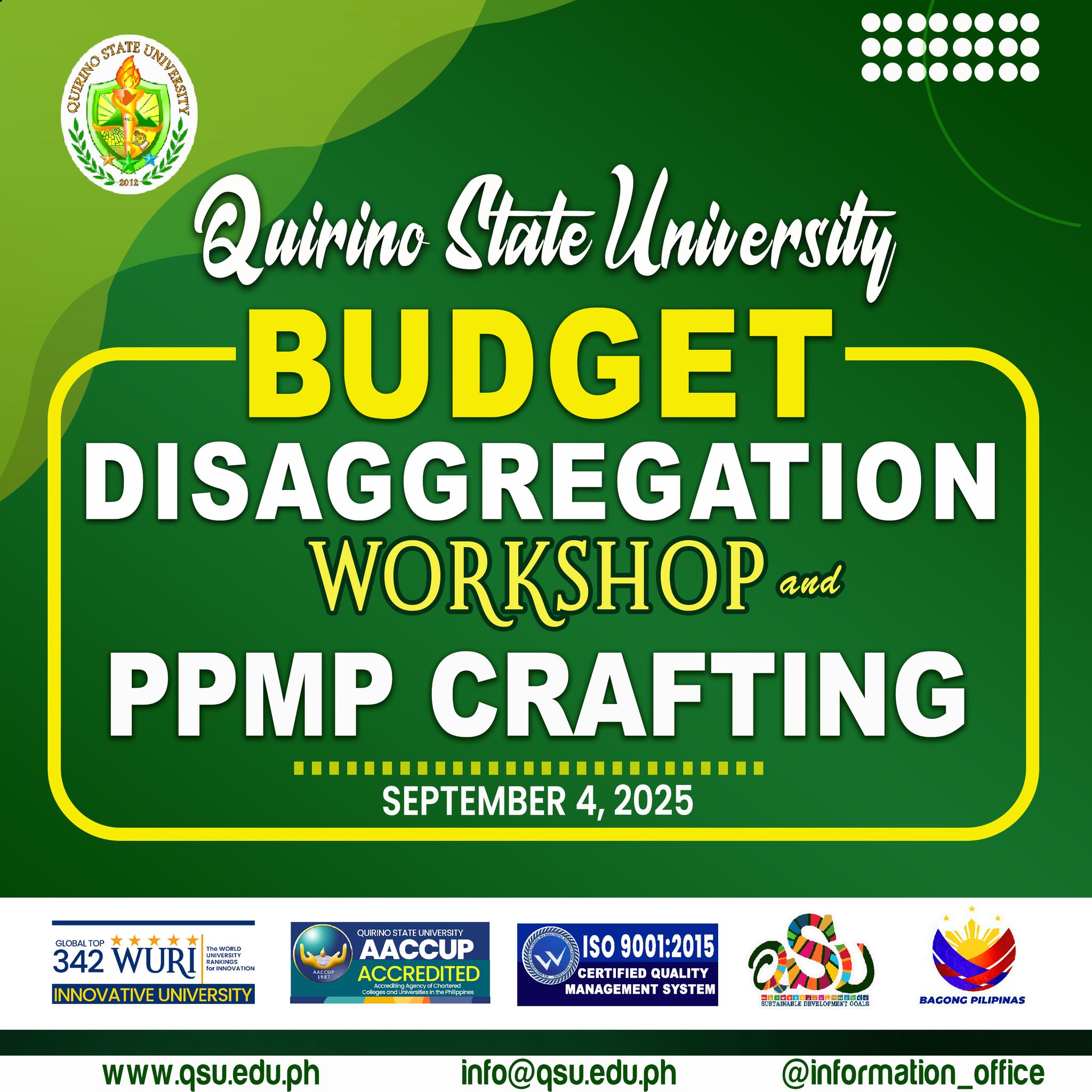 The University held the “Budget Disaggregation Workshop and PPMP Crafting for FY 2026” today, September 4, as a step toward strategic financial management for the upcoming fiscal year. Held at the QSU Amphitheatre, Diffun Campus, the event convened key university officials from Diffun, Cabarroguis, and Maddela Campuses. The activity commenced with a preliminary program, followed continue reading : ๐๐๐ ๐ฐ๐จ๐ซ๐ค๐ฌ๐ก๐จ๐ฉ ๐๐จ๐ง๐ฏ๐๐ง๐๐ฌ ๐จ๐๐๐ข๐๐ข๐๐ฅ๐ฌ ๐๐จ๐ซ ๐ฌ๐ญ๐ซ๐๐ญ๐๐ ๐ข๐ ๐๐ฎ๐๐ ๐๐ญ ๐ฉ๐ฅ๐๐ง๐ง๐ข๐ง๐
