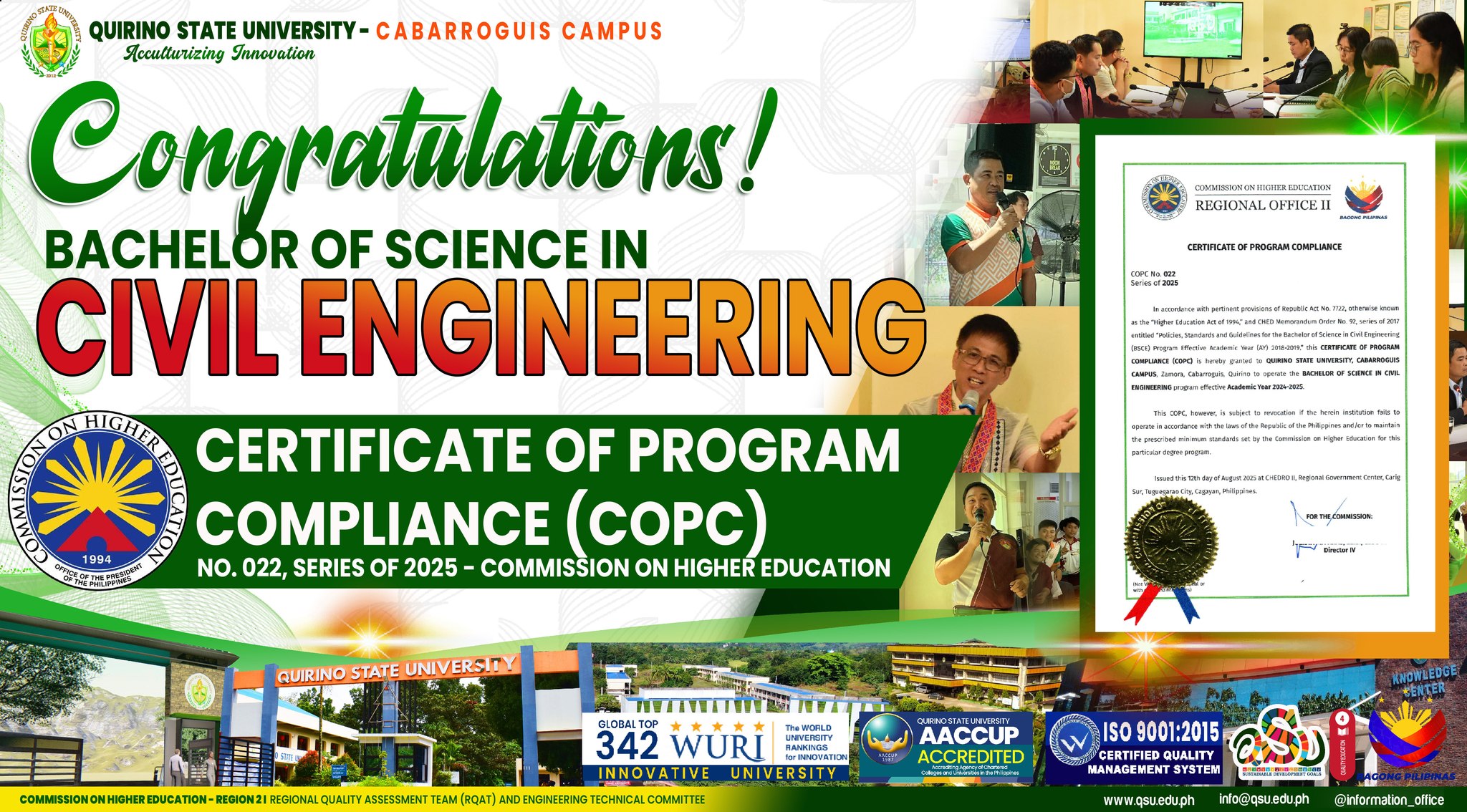 The Universityโs Bachelor of Science in Civil Engineering (BSCE) in Cabarroguis Campus has been officially awarded a Certificate of Program Compliance (COPC) by the Commission on Higher Education (CHED. The certification, CHED COPC No. 022, Series of 2025, confirms that the BSCE program has met the stringent requirements of CHED Memorandum Order (CMO) No. 92, continue reading : ๐๐๐’๐ฌ ๐๐ข๐ฏ๐ข๐ฅ ๐๐ง๐ ๐ข๐ง๐๐๐ซ๐ข๐ง๐ ๐๐ซ๐จ๐ ๐ซ๐๐ฆ ๐๐๐๐ฌ ๐ง๐๐ญ๐ข๐จ๐ง๐๐ฅ ๐๐จ๐ฆ๐ฉ๐ฅ๐ข๐๐ง๐๐ ๐๐๐ซ๐ญ๐ข๐๐ข๐๐๐ญ๐ข๐จ๐ง