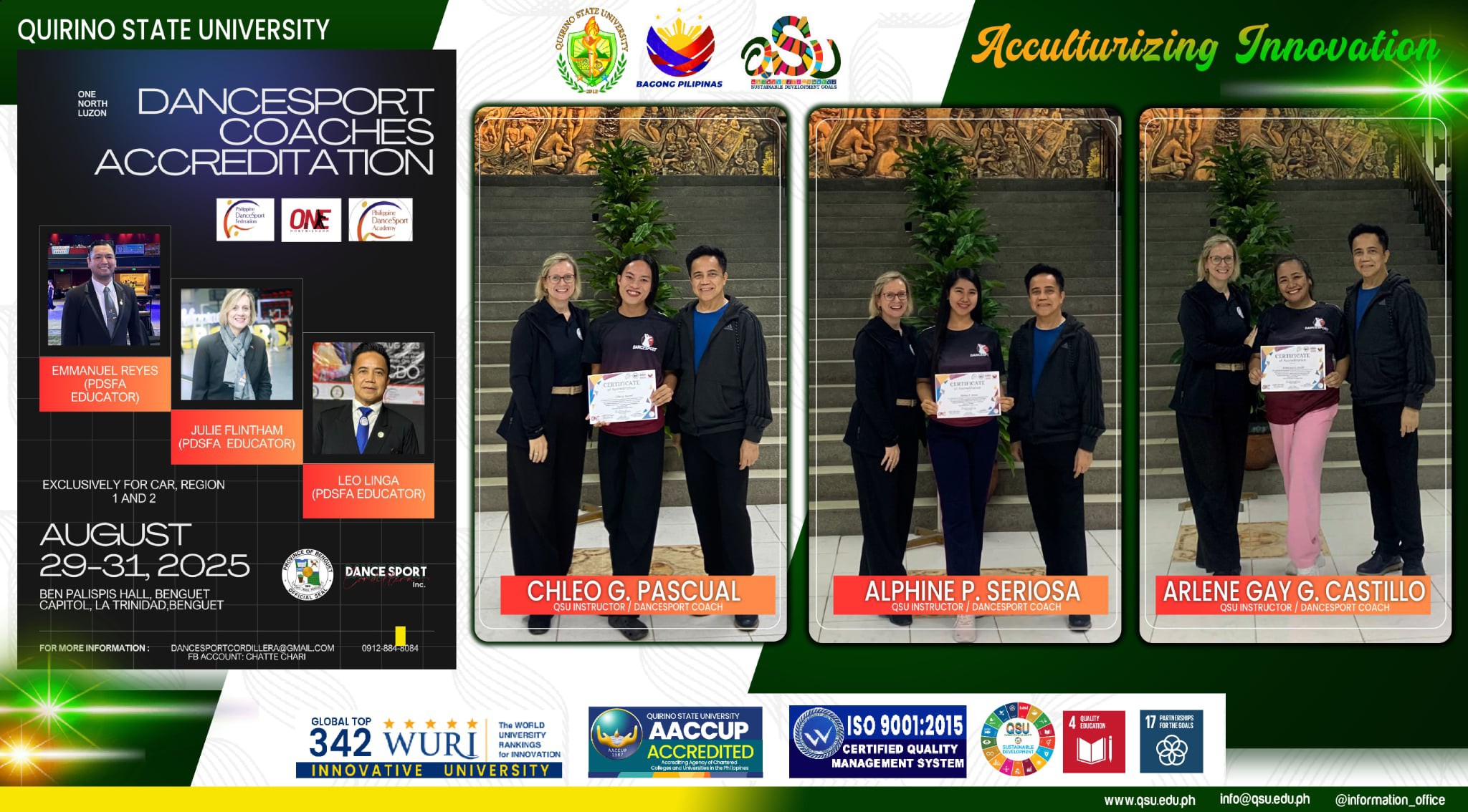 Three faculty members of the University have been accredited by the Philippine DanceSport Federation Academy as coaches for Latin American and Modern Standard DanceSport. The newly accredited coaches are Ms. Arlene Gay C. Castillo and Mr. Chleo G. Pascual from Cabarroguis Campus, and Ms. Alphine P. Seriosa from Diffun Campus. The trio successfully completed and continue reading : ๐๐๐ ๐๐จ๐๐๐ก๐๐ฌ ๐ ๐๐ข๐ง ๐ง๐๐ญ๐ข๐จ๐ง๐๐ฅ ๐๐๐๐ซ๐๐๐ข๐ญ๐๐ญ๐ข๐จ๐ง ๐ข๐ง ๐๐๐ง๐๐๐๐ฉ๐จ๐ซ๐ญ