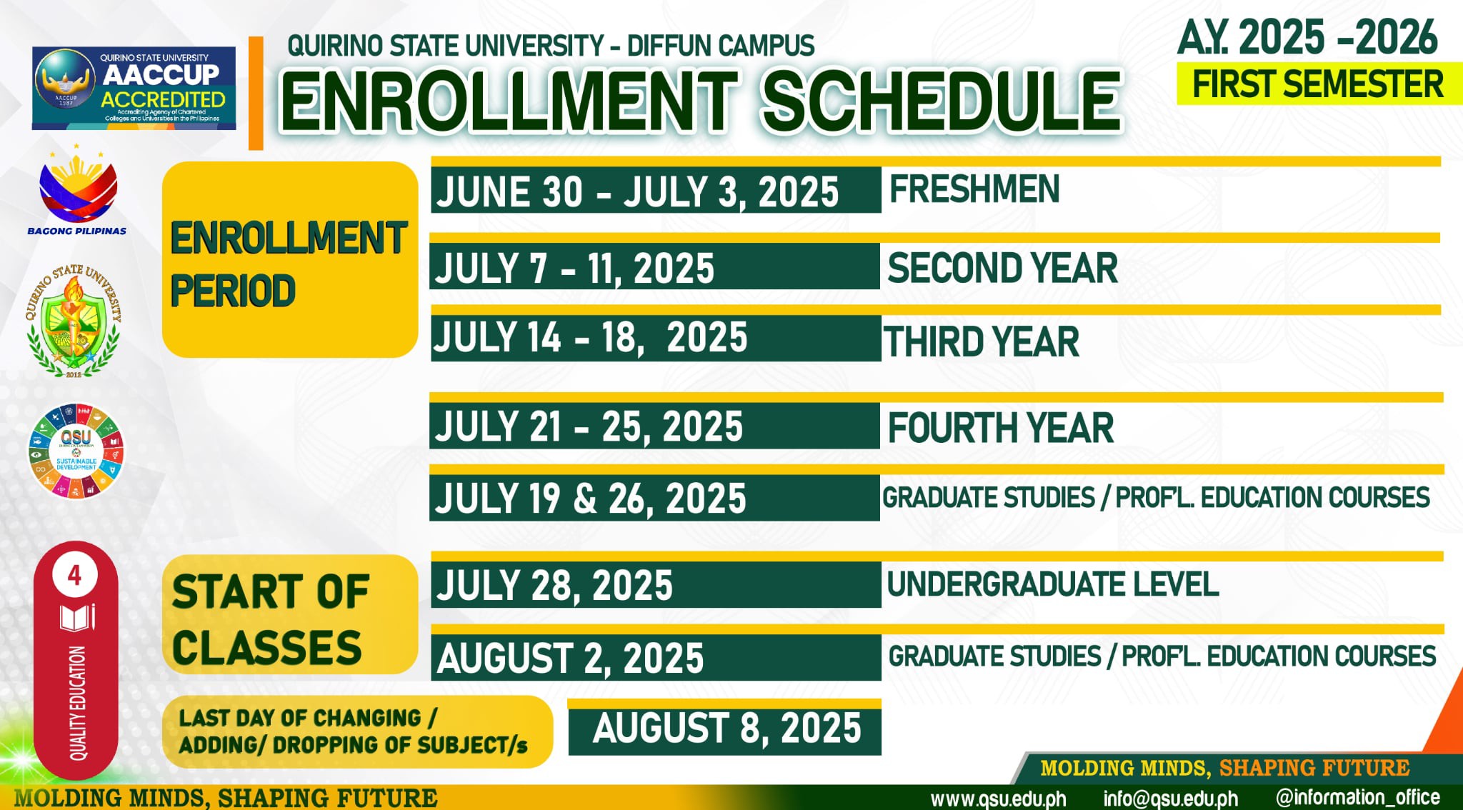 We are pleased to announce the official enrollment schedule and start of classes for the Academic Year 2025-2026 at Diffun Campus! Mark your calendars and prepare for an exciting new chapter at QSU. ๐ Enrollment Period: Enrollment for new and returning students will run from June 30 to July 26, 2025. Ensure you complete your continue reading : ๐๐ญ๐ญ๐๐ง๐ญ๐ข๐จ๐ง, ๐๐๐๐๐ง๐ฌ!