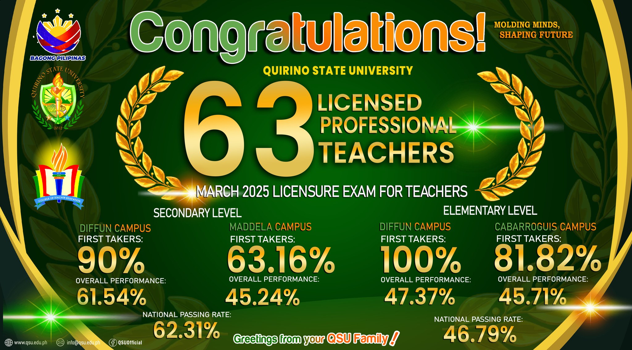 The Universityโs teacher education program graduates from its Cabarroguis, Diffun, and Maddela Campuses achieved a stellar performance in the Licensure Examination for Teachers (LET), held last March 23, 2025. The University’s first-taker rate performance surpassed the national passing rate in all campuses, showcasing its dedication to producing competent educators. Diffun Campusโs Bachelor of Elementary Education continue reading : ๐๐๐ ๐ญ๐๐๐๐ก๐๐ซ ๐๐๐ฎ๐๐๐ญ๐ข๐จ๐ง ๐ฉ๐ซ๐จ๐ ๐ซ๐๐ฆ๐ฌ ๐๐๐ซ๐จ๐ฌ๐ฌ ๐๐๐ฆ๐ฉ๐ฎ๐ฌ๐๐ฌ ๐๐ฑ๐๐๐๐ ๐๐๐ซ๐๐ก ๐๐๐๐ ๐๐๐ ๐ง๐๐ญ๐ข๐จ๐ง๐๐ฅ ๐ฉ๐๐ฌ๐ฌ ๐ซ๐๐ญ๐