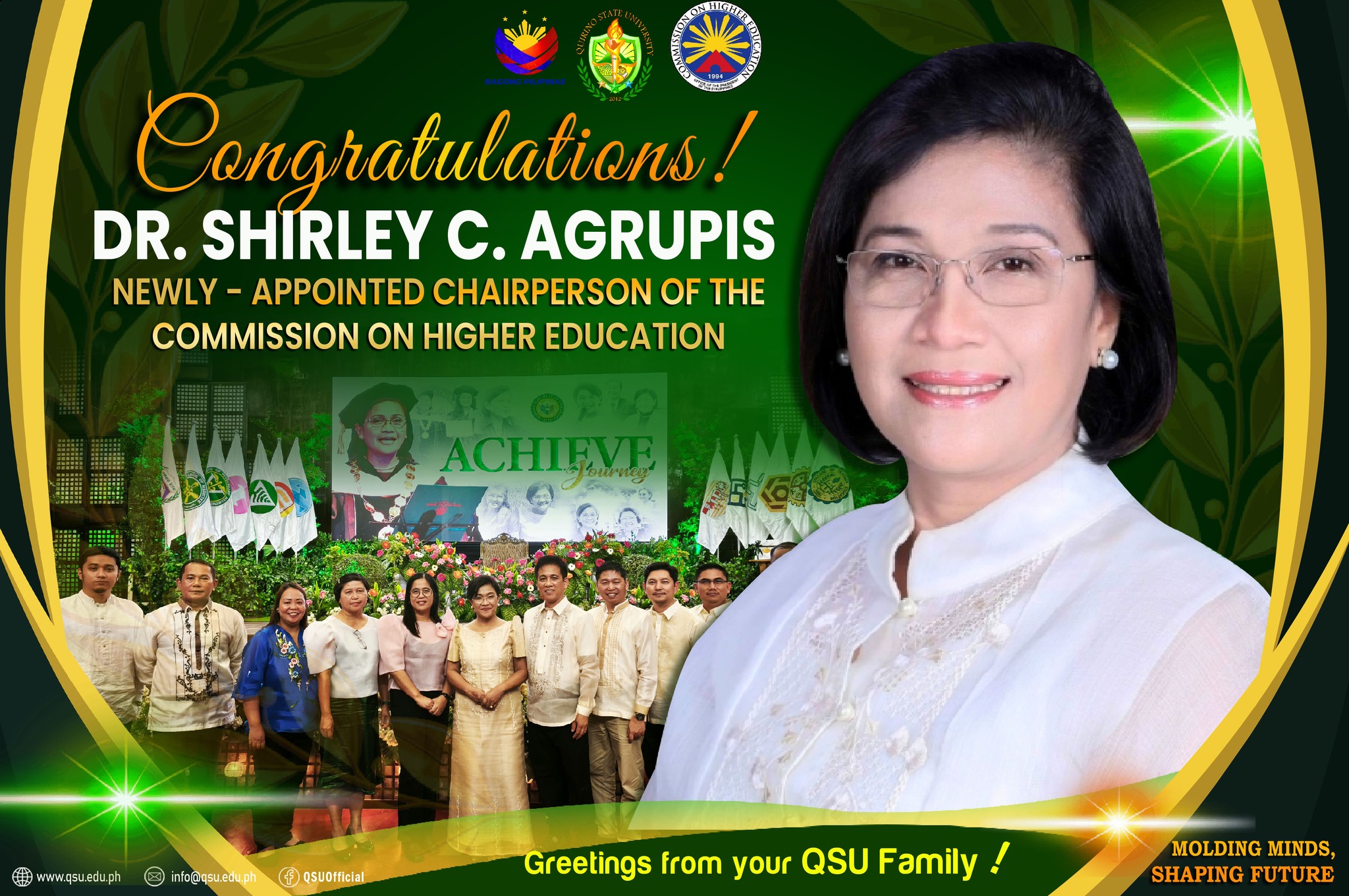 University President Hermenegildo F. Samoy, Jr., and the QSU community extend their warmest congratulations to Dr. Shirley C. Agrupis on her appointment as Chairperson of the Commission on Higher Education (CHED). The University wishes Dr. Agrupis great success in her new role and looks forward to her leadership in guiding QSU toward new heights of continue reading : ๐๐ซ. ๐๐ก๐ข๐ซ๐ฅ๐๐ฒ ๐. ๐๐ ๐ซ๐ฎ๐ฉ๐ข๐ฌ ๐ข๐ฌ ๐ญ๐ก๐ ๐ง๐๐ฐ ๐๐๐๐ ๐๐ก๐๐ข๐ซ๐ฉ๐๐ซ๐ฌ๐จ๐ง!