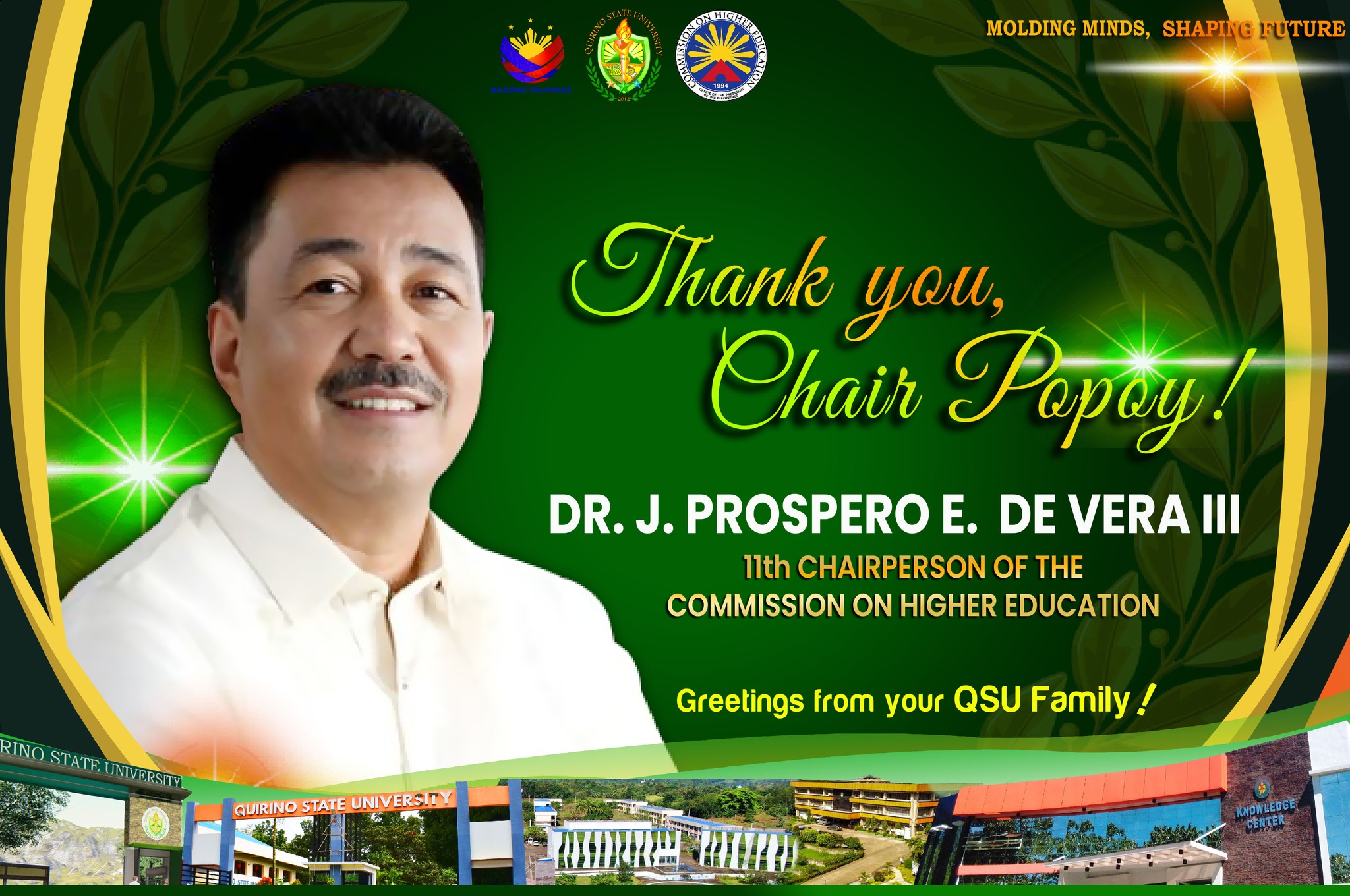 The University expresses its profound gratitude to Dr. J. Prospero “Popoy” De Vera III for his exceptional leadership and dedicated service as CHED Chairperson. His guidance has been instrumental in the University’s development, establishing a robust foundation that has propelled it toward becoming a leading center for academic and technological excellence. QSU will always welcome continue reading : ๐ ๐๐ซ๐ข๐๐ฎ๐ญ๐ ๐ญ๐จ ๐๐ซ. ๐. ๐๐ซ๐จ๐ฌ๐ฉ๐๐ซ๐จ “๐๐จ๐ฉ๐จ๐ฒ” ๐๐ ๐๐๐ซ๐ ๐๐๐