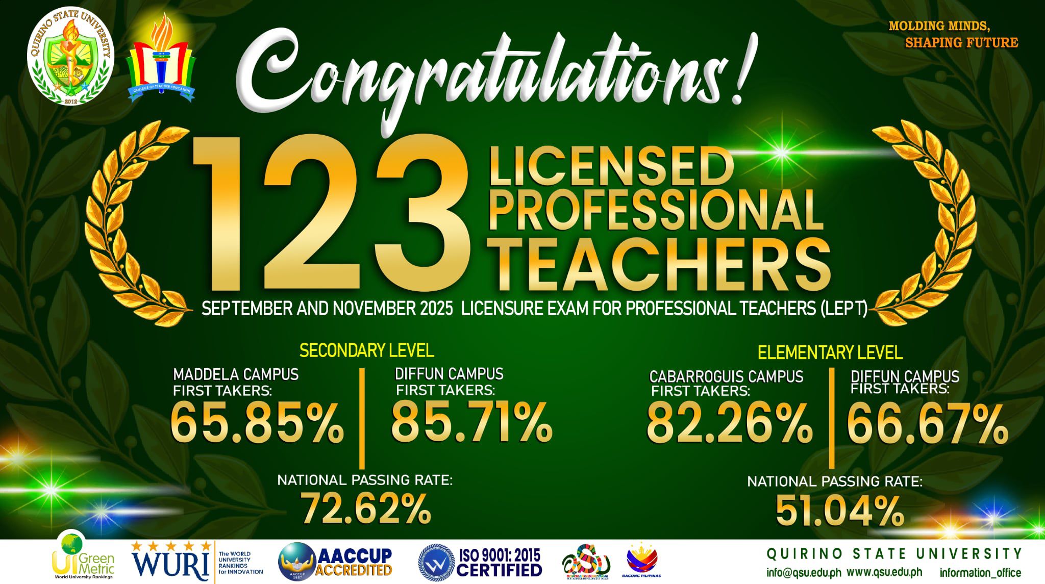 The University produced 123 professional teachers in the recent Licensure Examination for Teachers (LET) held on September 21 and November 30, 2025. Showcasing institutional excellence, the Bachelor of Elementary Education (BEED) program at the Cabarroguis Campus achieved an 82.26% passing rate for first-time takers, while the Diffun Campus attained 66.67%. Both ratings of the two continue reading : ๐๐ข๐๐๐ง๐ฌ๐๐ ๐๐ง๐ ๐ซ๐๐๐๐ฒ: ๐๐๐ ๐๐๐-๐๐ซ๐๐ ๐๐๐ฎ๐๐๐ญ๐จ๐ซ๐ฌ ๐ฌ๐๐ญ ๐ญ๐จ ๐ฃ๐จ๐ข๐ง ๐ญ๐ก๐ ๐ฉ๐ซ๐จ๐๐๐ฌ๐ฌ๐ข๐จ๐ง๐๐ฅ ๐ฐ๐จ๐ซ๐ค๐๐จ๐ซ๐๐