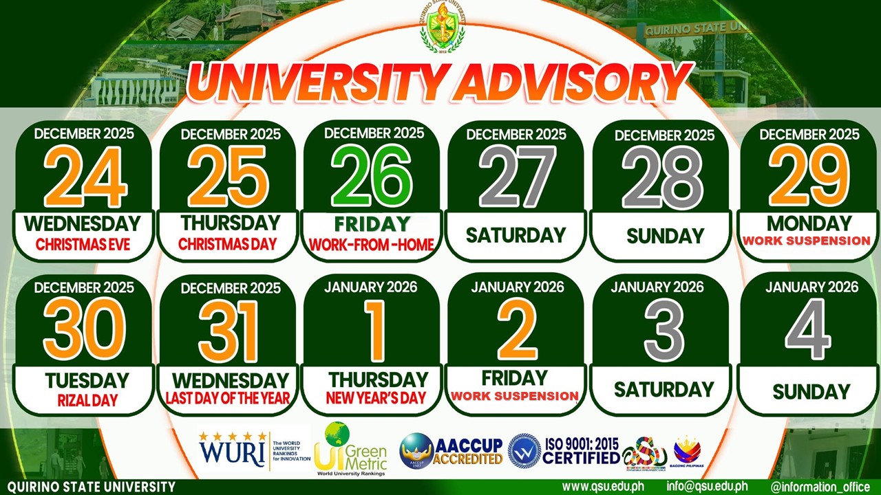 In view of the Christmas and New Year holidays, and to allow the personnel to manage post-holiday commitments while ensuring continuity of essential university operations, a Work-from-Home (WFH) arrangement is authorized on December 26, 2025. Further, usual office operations are suspended on December 29, 2025 and January 2, 2026 in adherence to Memorandum Circular No.111, continue reading : ๐๐๐๐๐๐๐๐๐๐๐๐ ๐ ๐๐๐ ๐๐๐ ๐๐ ๐ ๐๐๐ ๐๐ ๐๐๐ ๐๐๐๐๐๐๐๐๐๐ ๐๐๐๐๐๐๐๐๐