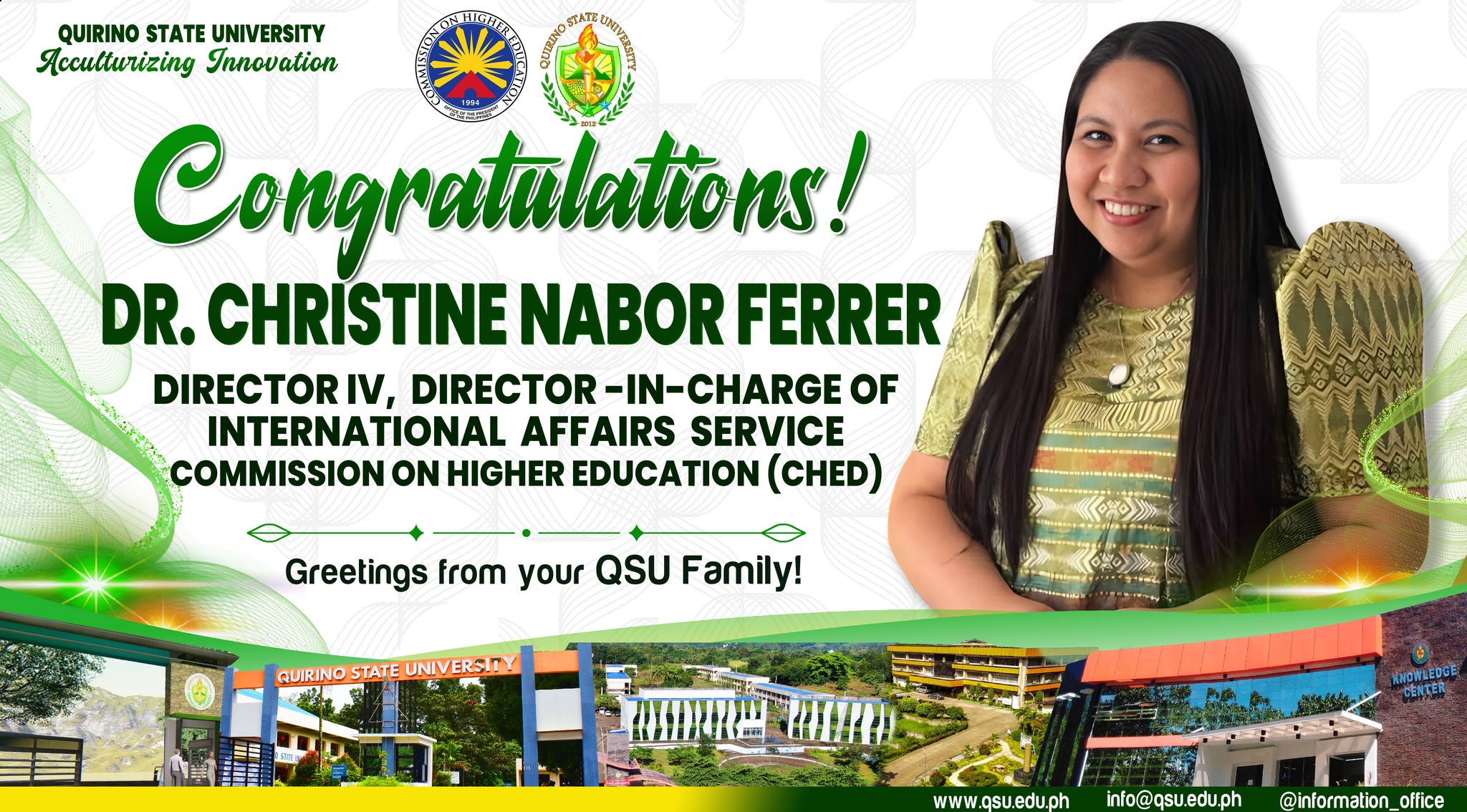 Quirino State University joins the academic community in celebrating the appointment of Dr. Christine Nabor-Ferrer as the new Director IV of CHEDโs International Affairs Service. The University looks forward to working under her guidance to strengthen global partnerships and expand international opportunities for our faculty and students.We are confident that her leadership will pave the continue reading : ๐๐ซ. ๐๐ก๐ซ๐ข๐ฌ๐ญ๐ข๐ง๐ ๐๐๐๐จ๐ซ-๐ ๐๐ซ๐ซ๐๐ซ ๐ข๐ฌ ๐ญ๐ก๐ ๐ง๐๐ฐ ๐๐๐๐-๐๐๐ ๐๐ข๐ซ๐๐๐ญ๐จ๐ซ ๐๐