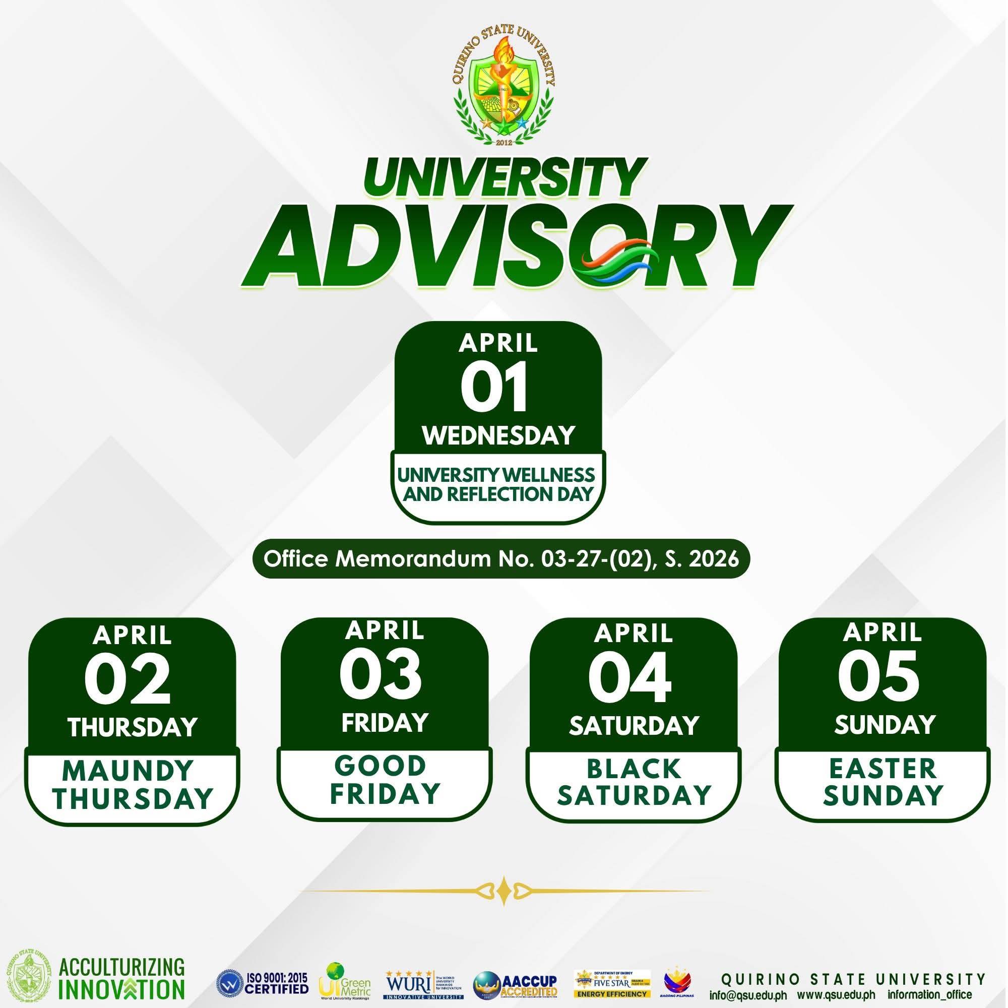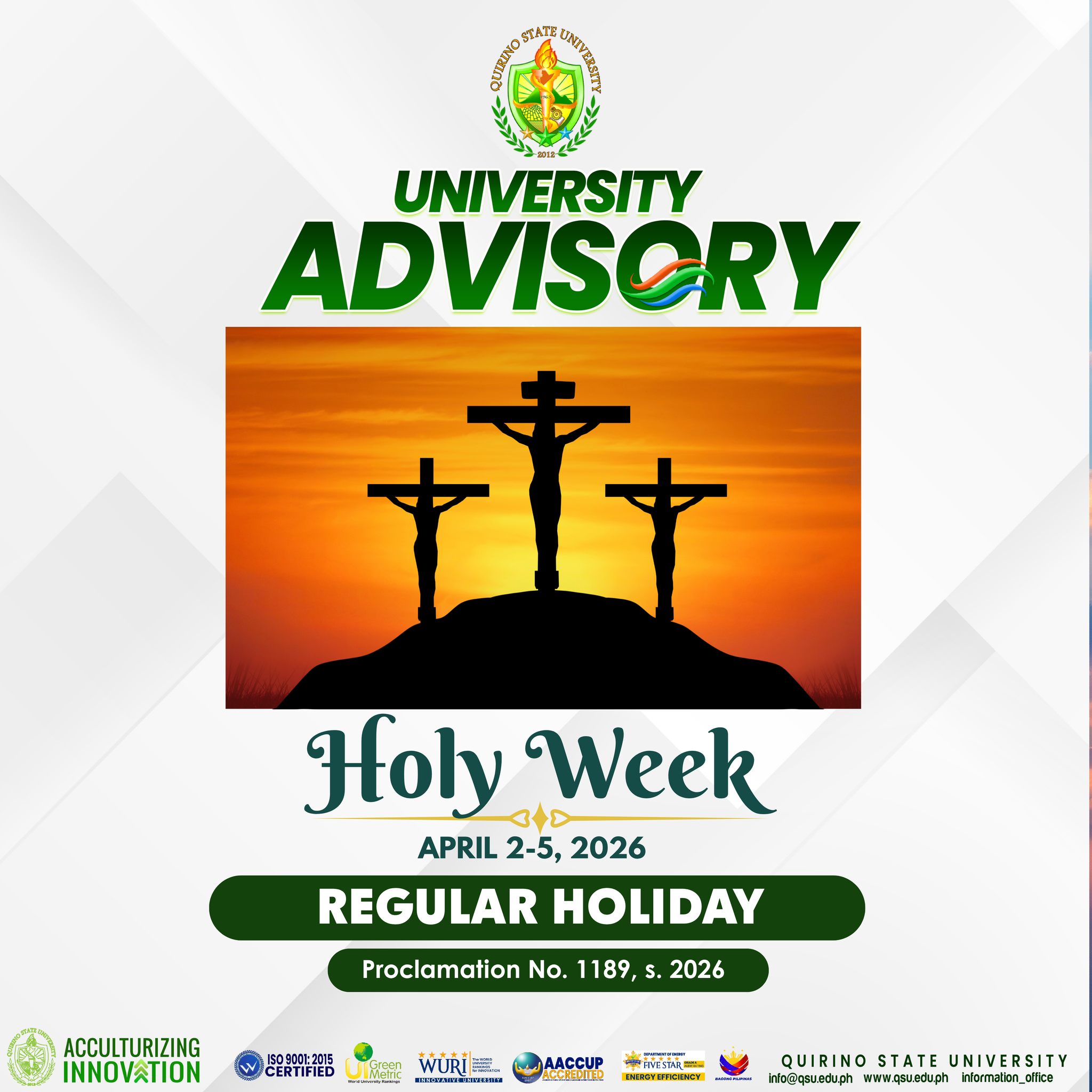 𝐅𝐚𝐢𝐭𝐡.𝐑𝐞𝐟𝐥𝐞𝐜𝐭𝐢𝐨𝐧.𝐏𝐞𝐚𝐜𝐞. Quirino State University joins the nation in observing the Holy Week. As we pause for this period of solemn reflection, we wish the academic community a peaceful and meaningful time for spiritual renewal and rest.