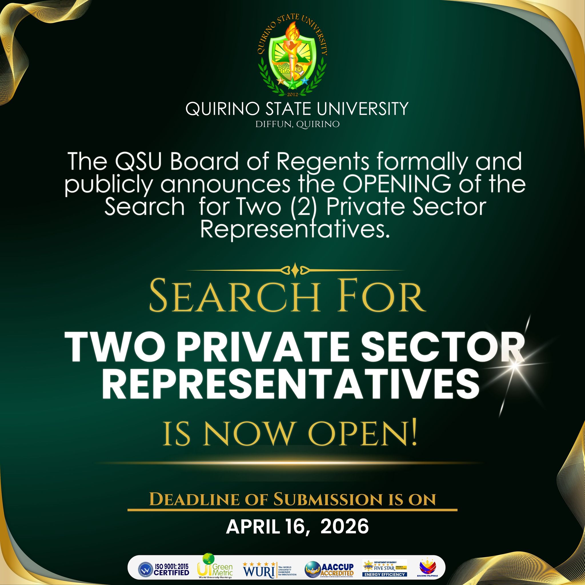 The QSU Board of Regents formally and publicly announces the OPENING of the Search for Two (2) Private Sector Representatives.