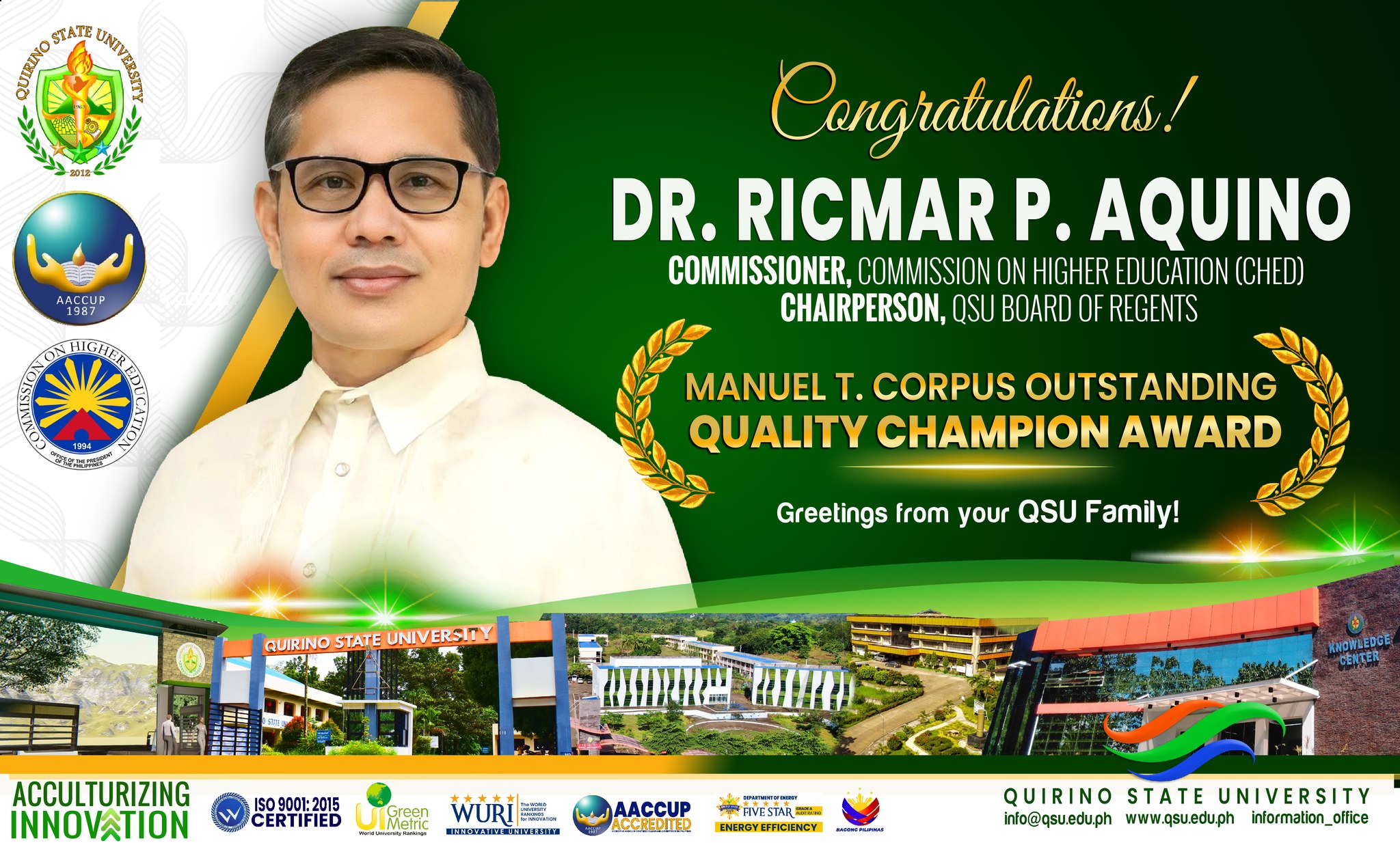 The Quirino State University and Dr. Alfonso R. Simon, OIC-President, warmly congratulate 𝐇𝐨𝐧. 𝐑𝐢𝐜𝐦𝐚𝐫 𝐏. 𝐀𝐪𝐮𝐢𝐧𝐨, CHED Commissioner and University Board of Regents Chairperson on his achievement as one of the Manuel T. Corpus Outstanding Quality Champion Awardees. The said accolade was awarded by the Accrediting Agency of Chartered Colleges and Universities in the Philippines continue reading : Manuel T. Corpus Outstanding Quality Champion Awardees