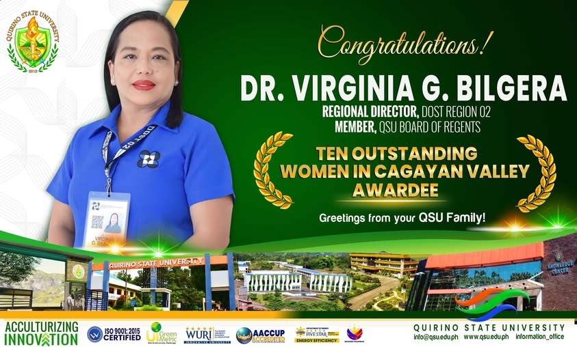 The QSU community extends its warmest congratulations to Dr. Virginia G. Bilgera, esteemed member of the University Board of Regents and Regional Director of the Department of Science and Technology (DOST) Region 2, for being hailed as one of the Ten Outstanding Women in Cagayan Valley. Dr. Bilgera was recently recognized as a regional awardee continue reading : Ten Outstanding Women in Cagayan Valley