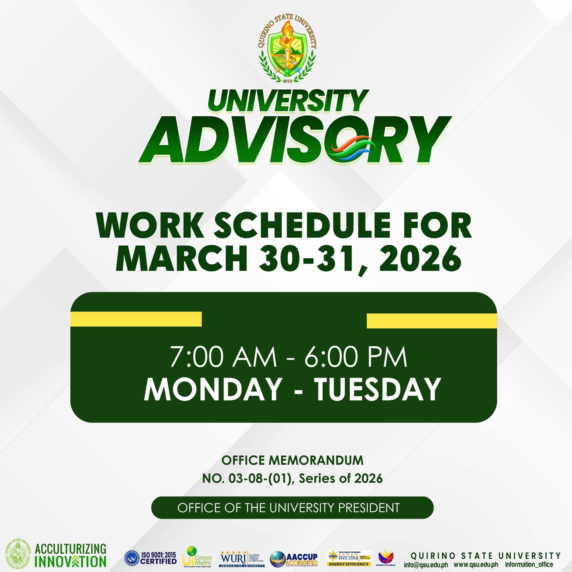The University reminds all employees to follow the 7:00 AM – 6:00 PM work schedule tomorrow and on Tuesday (March 30-31, 2026). This work arrangement is in compliance with Memorandum Circular No. 114, s. 2026. Thank you for your cooperation in maintaining our services and in supporting our conservation initiatives. 𝐐𝐈𝐎 𝐰𝐢𝐭𝐡 𝐎𝐈𝐂-𝐏𝐫𝐞𝐬𝐢𝐝𝐞𝐧𝐭 𝐀𝐥𝐟𝐨𝐧𝐬𝐨 𝐑. continue reading : 𝐈𝐌𝐏𝐎𝐑𝐓𝐀𝐍𝐓 𝐑𝐄𝐌𝐈𝐍𝐃𝐄𝐑: