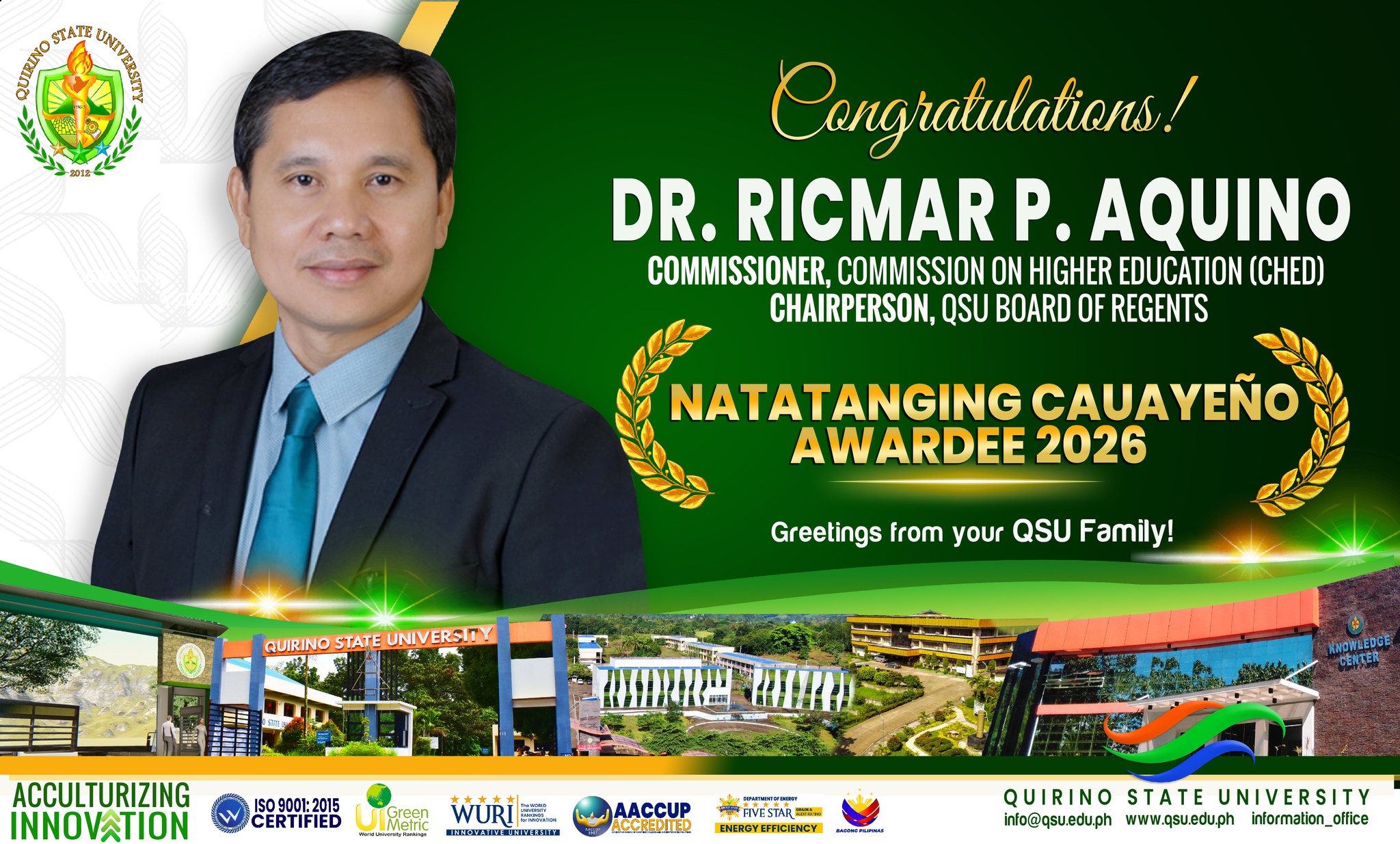 The Quirino State University and Dr. Alfonso R. Simon, OIC-President, proudly congratulate 𝐇𝐎𝐍. 𝐑𝐈𝐂𝐌𝐀𝐑 𝐏. 𝐀𝐐𝐔𝐈𝐍𝐎, CHED Commissioner and Chairperson of the QSU Board of Regents, on his remarkable achievement as one of the awardees of the Natatanging Cauayeño 2026. This prestigious honor celebrates his outstanding contributions and exemplary leadership as a distinguished public servant continue reading : Natatanging Cauayeño 2026