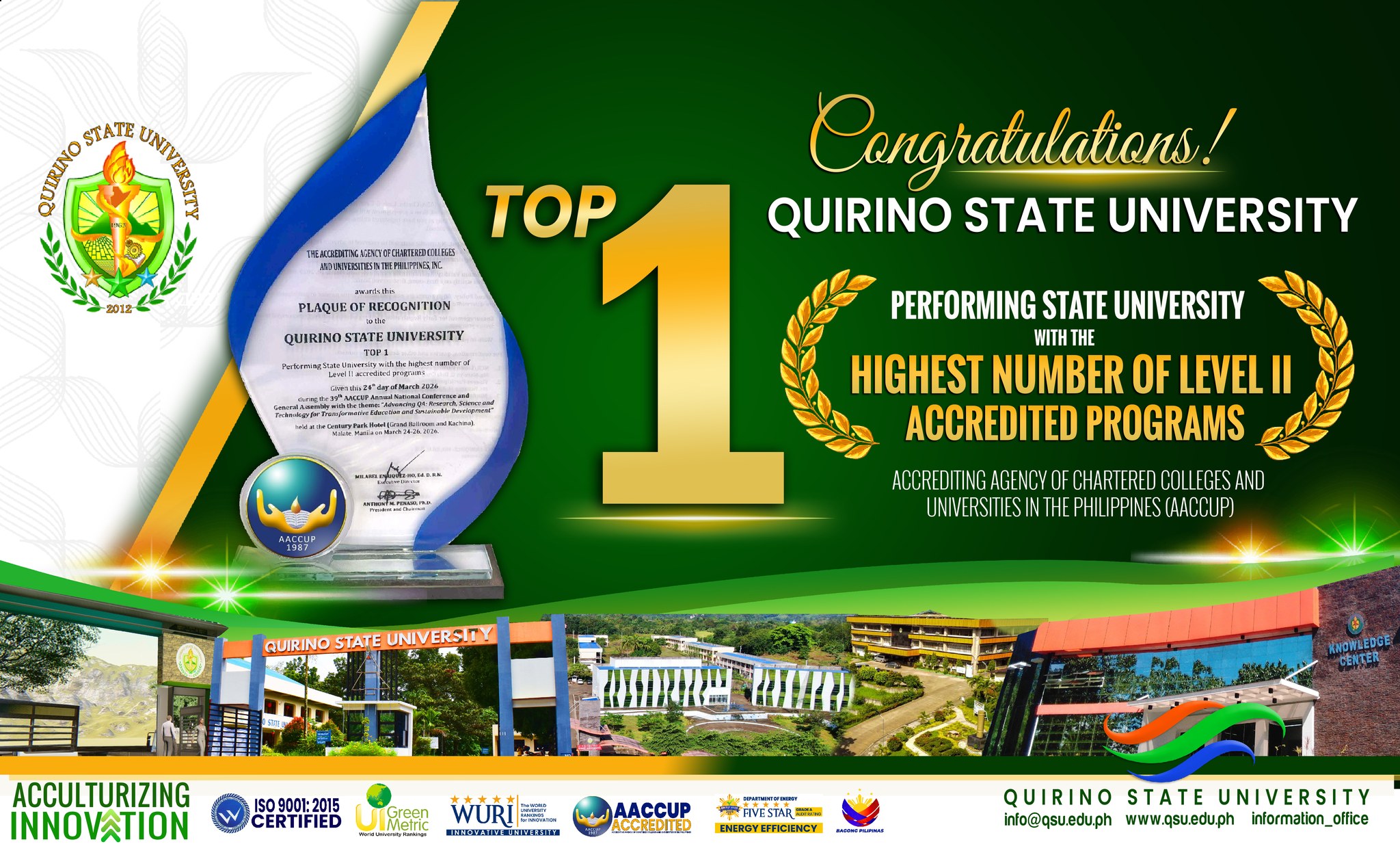 Setting a new benchmark for academic quality, Quirino State University emerged as the Top 1 Performing State University with the highest number of Level II accredited programs nationwide. The award was conferred by the Accrediting Agency of Chartered Colleges and Universities in the Philippines (AACCUP) during its 39th Annual National Conference and General Assembly, held continue reading : 𝐐𝐒𝐔 𝐰𝐚𝐬 𝐫𝐞𝐜𝐨𝐠𝐧𝐢𝐳𝐞𝐝 𝐚𝐬 𝐓𝐨𝐩 𝟏 𝐰𝐢𝐭𝐡 𝐡𝐢𝐠𝐡𝐞𝐬𝐭 𝐋𝐞𝐯𝐞𝐥 𝐈𝐈 𝐚𝐜𝐜𝐫𝐞𝐝𝐢𝐭𝐞𝐝 𝐩𝐫𝐨𝐠𝐫𝐚𝐦𝐬!