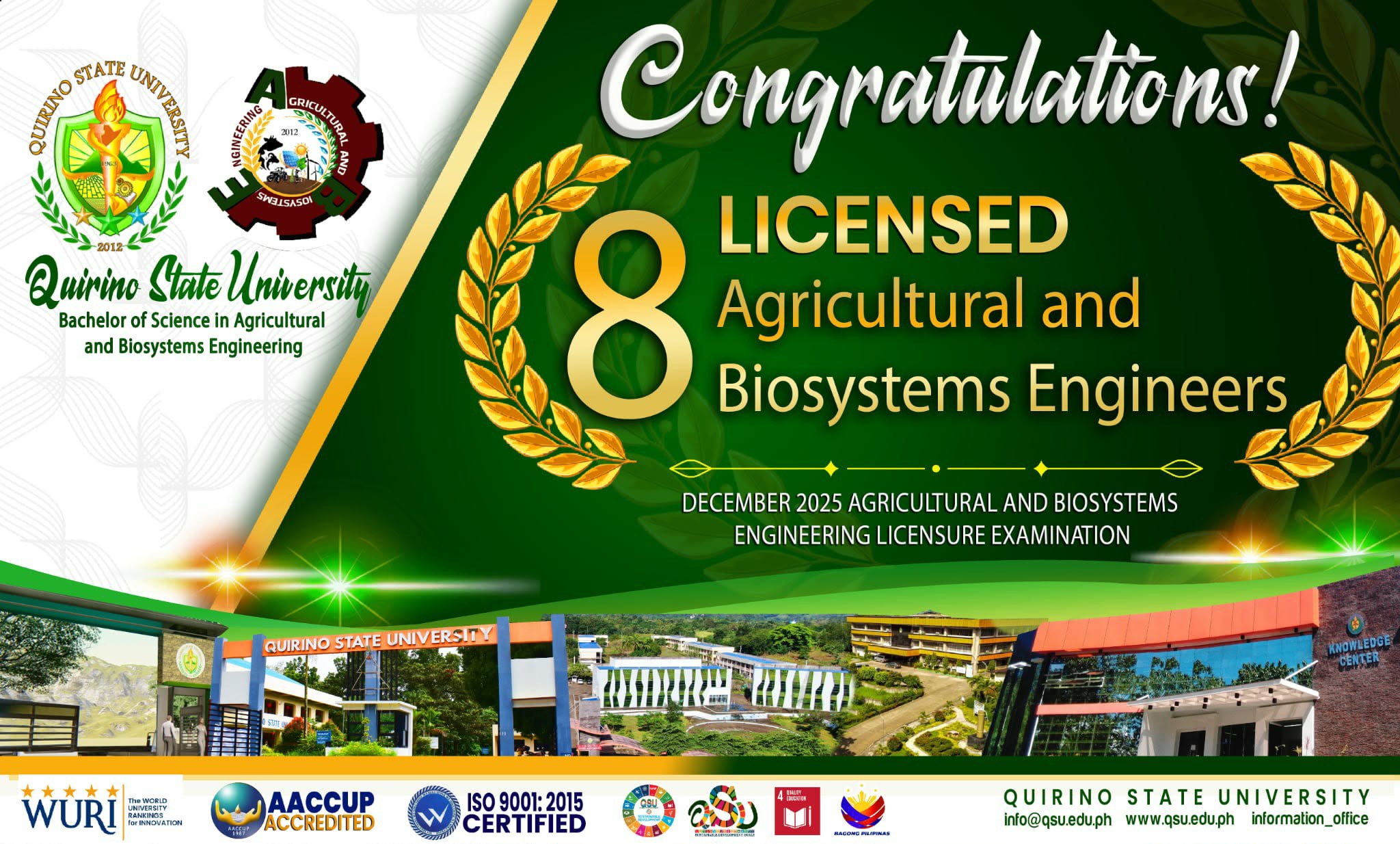 The University warmly congratulates the eight new licensed engineers who successfully passed the recent Agriculture and Biosystems Engineer Licensure Examination (ABELE). As officially posted on the Professional Regulation Commission (PRC) website, the University gained a 30.77% passing rate in the examination. We extend our sincerest wishes for a fulfilling career and continued success to our continue reading : ๐๐๐ ๐ฉ๐ซ๐จ๐๐ฎ๐๐๐ฌ ๐ ๐ง๐๐ฐ ๐๐ ๐๐ง๐ ๐ข๐ง๐๐๐ซ๐ฌ