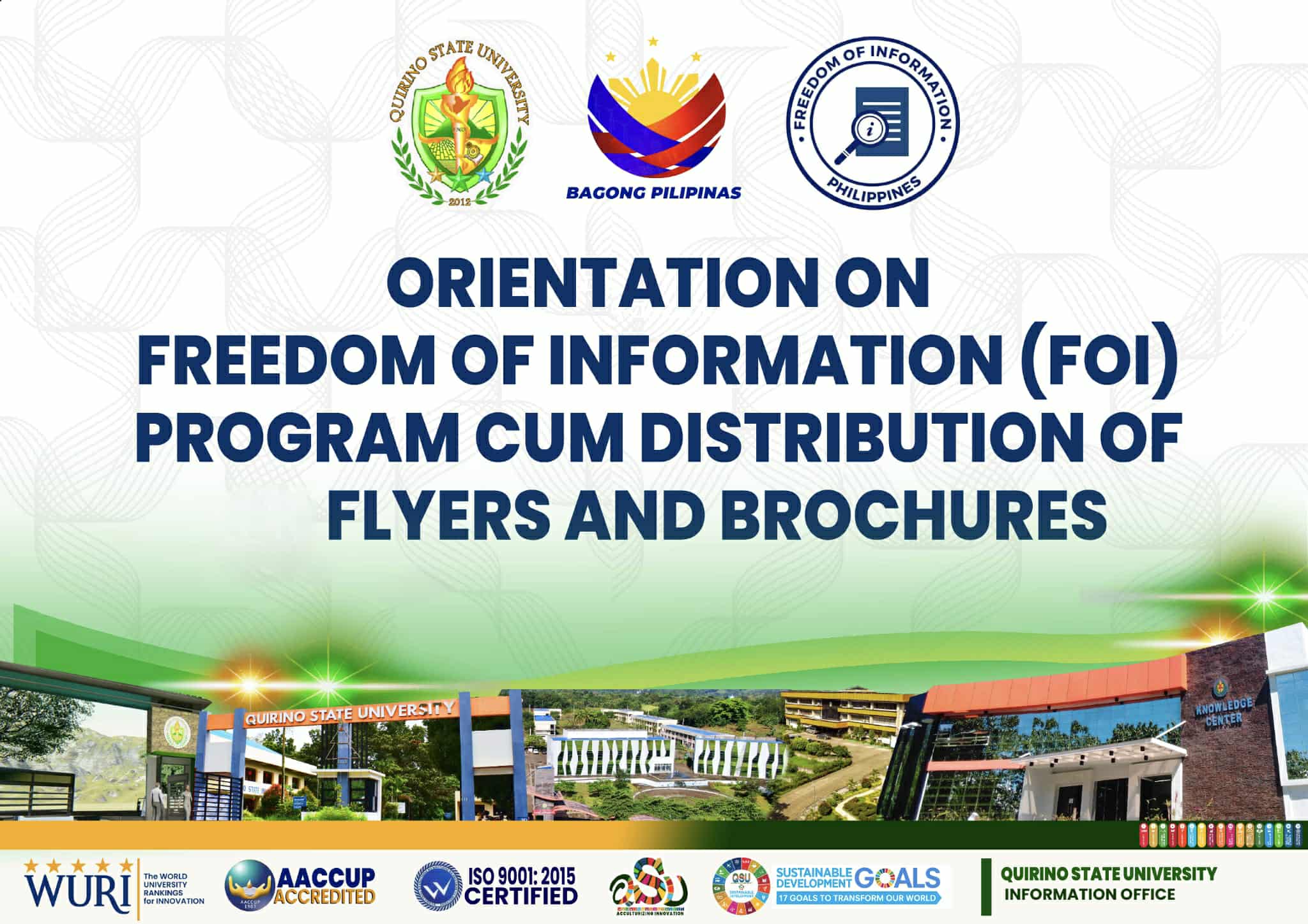 In a move to promote transparency and public accountability in the institution, the Universityโs Information Office (QIO) held the โOrientation on Freedom of Information (FOI) Program cum Distribution of Flyers and Brochuresโ on September 16, 2025. The event was conducted at the Learning Resource Center, JAA Building, Diffun Campus, as part of the “QSU Synergy” continue reading : ๐๐๐ ๐๐ง๐๐จ๐ซ๐ฆ๐๐ญ๐ข๐จ๐ง ๐๐๐๐ข๐๐ ๐ก๐จ๐ฅ๐๐ฌ ๐ ๐๐ ๐๐ซ๐ข๐๐ง๐ญ๐๐ญ๐ข๐จ๐ง