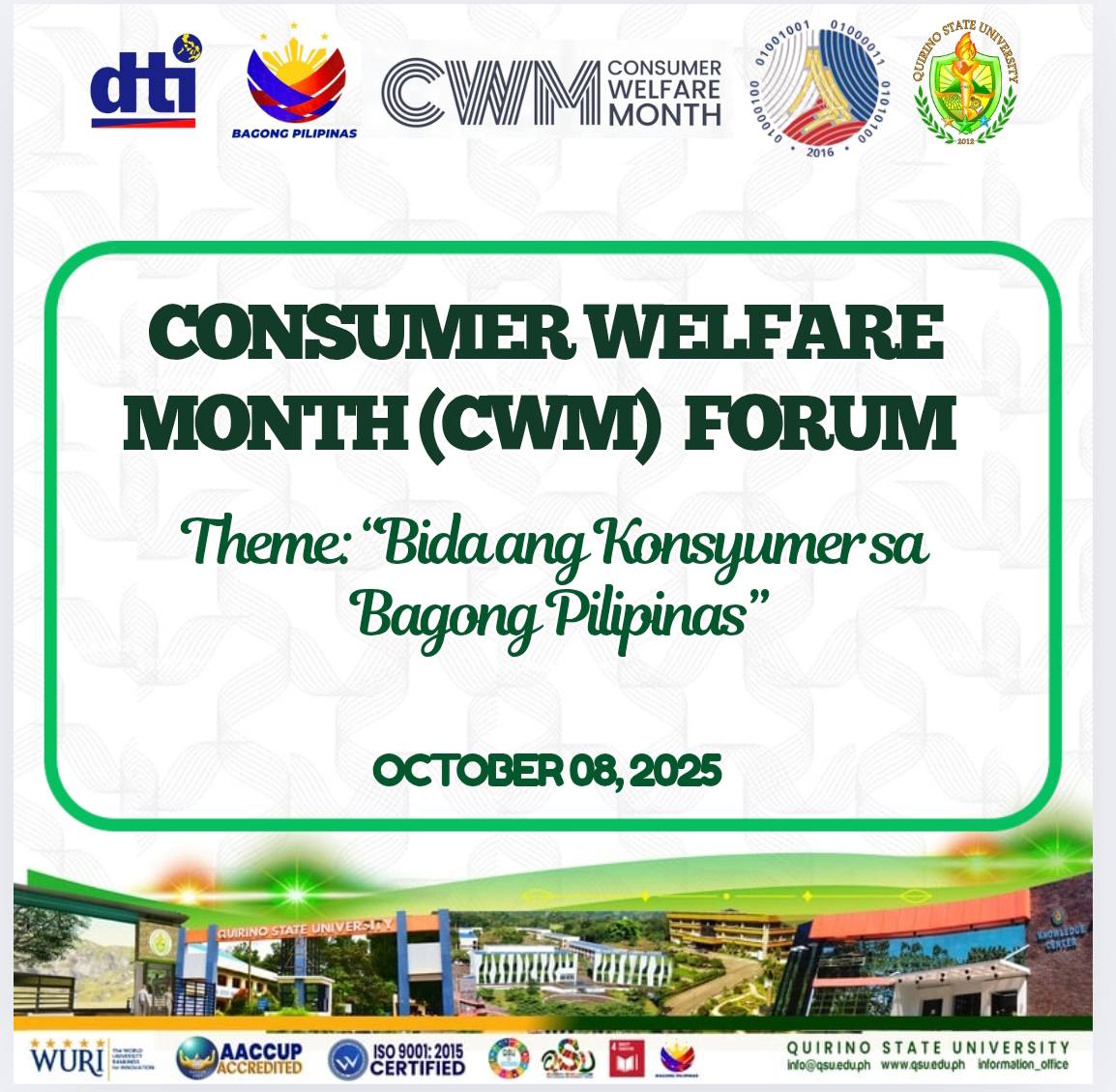 The Department of Trade and Industry (DTI)โQuirino, in partnership with Quirino State University (QSU), held a Consumer Welfare Forum today, October 8 at the Learning Resource Center, JAAH Building, Diffun Campus. Around 100 students joined the event in line with this yearโs Consumer Welfare Month (CWM) Celebration with the theme โBida ang Konsyumer sa Bagong continue reading : ๐๐๐ ๐ฌ๐ญ๐ฎ๐๐๐ง๐ญ๐ฌ ๐๐ฆ๐ฉ๐จ๐ฐ๐๐ซ๐๐ ๐๐ฌ ๐ฌ๐ฆ๐๐ซ๐ญ ๐๐จ๐ง๐ฌ๐ฎ๐ฆ๐๐ซ๐ฌ ๐๐ญ ๐๐๐’๐ฌ ๐๐จ๐ซ๐ฎ๐ฆ