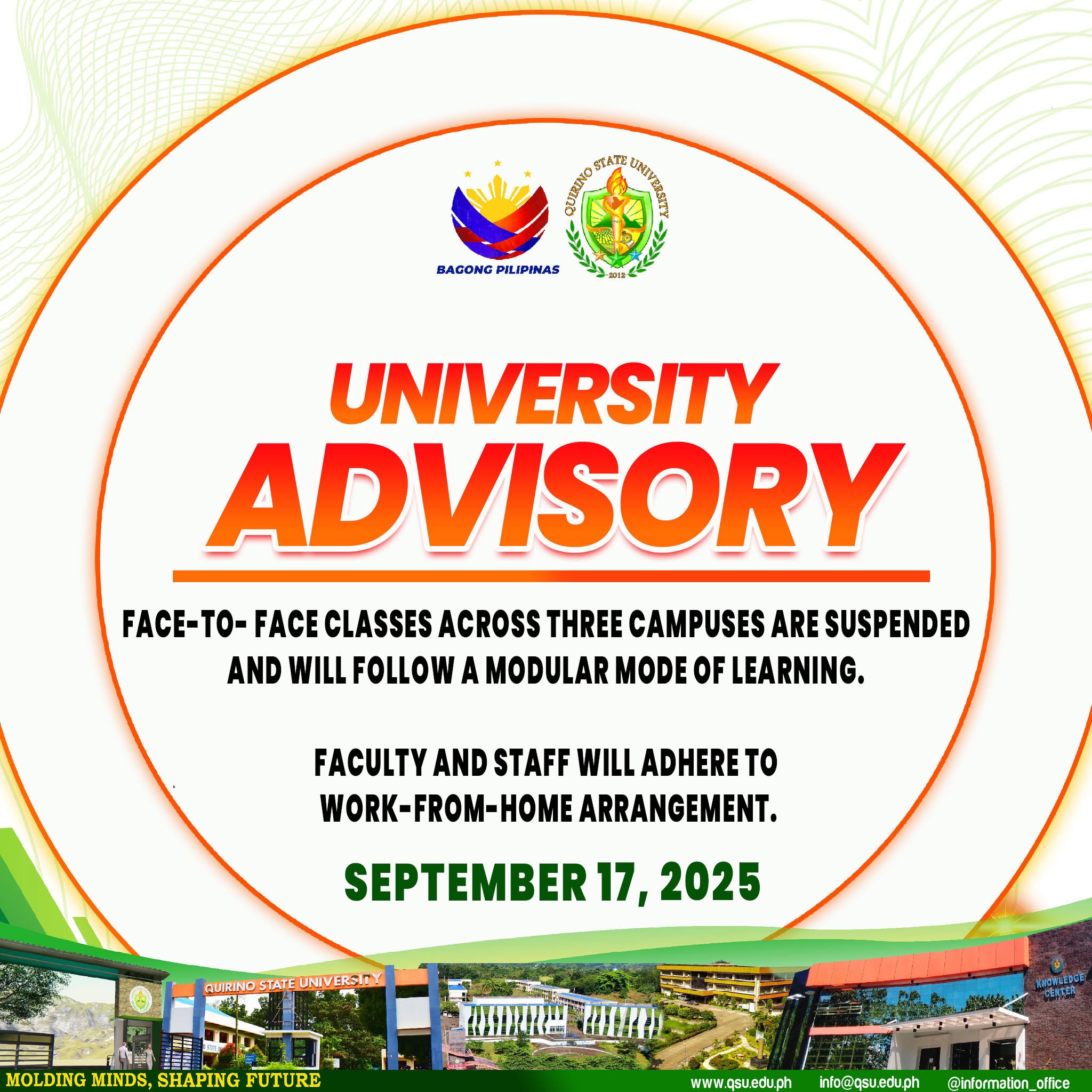 Pursuant to the Tropical Cyclone Bulletin No. 5 of the Philippine Atmospheric, Geophysical and Astronomical Services Administration (PAGASA) issued at 5:00 AM today, 17 September 2025, placing the Province of Quirino under Tropical Cyclone Wind Signal No. 1 due to Tropical Depression โMirasolโ, classes and office work in Quirino State University are hereby suspended. While continue reading : ๐๐๐๐๐๐๐๐๐๐๐๐ ๐ ๐๐๐ ๐๐๐ ๐๐ ๐ ๐๐๐ ๐๐ ๐๐๐ ๐๐๐๐๐๐๐๐๐๐ ๐๐๐๐๐๐๐๐๐