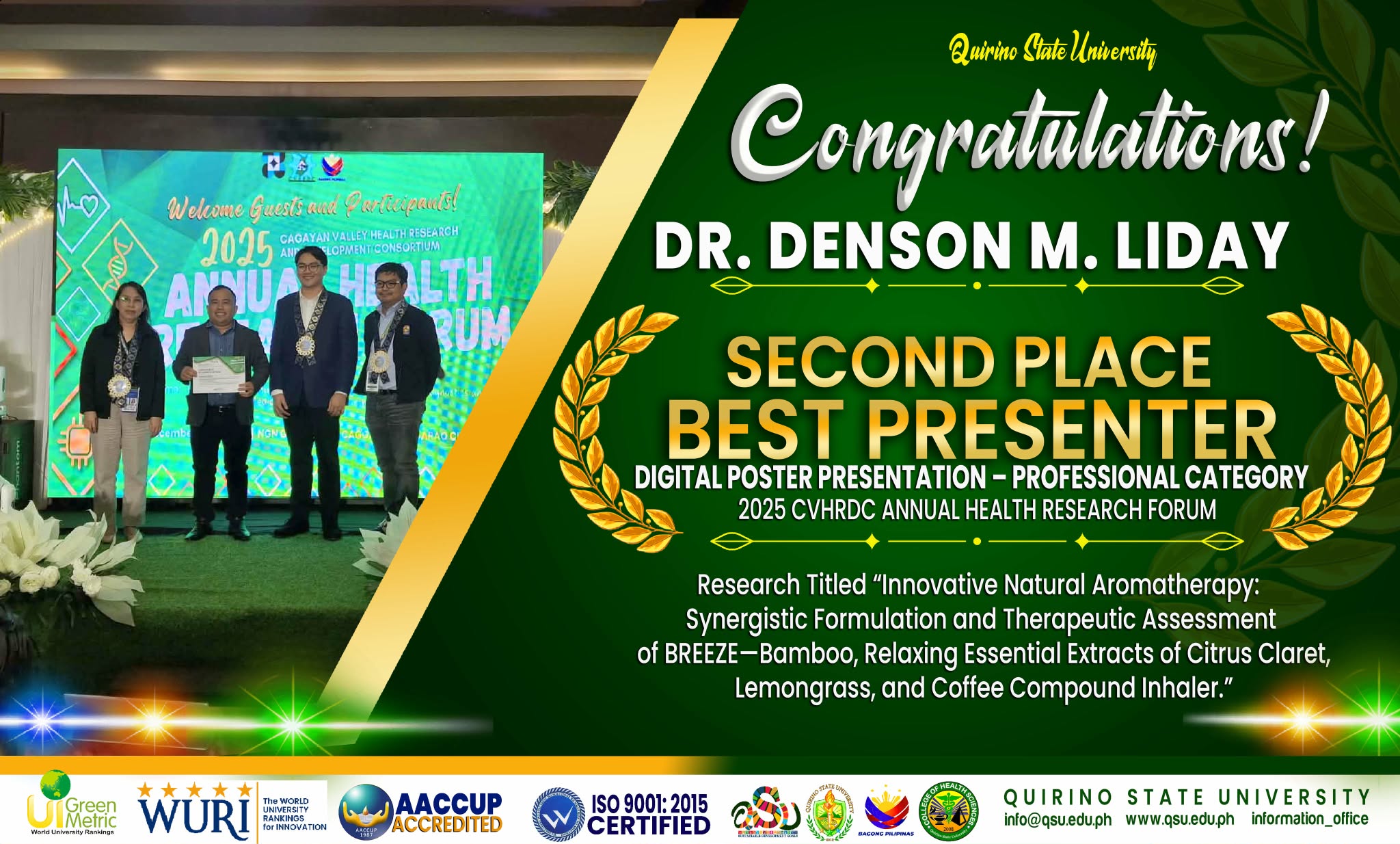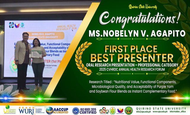 Ms. Nobelyn V. Agapito led the achievements by being awarded Best Presenter (1st Place) in the Oral Research Presentation category. Her study, titled โNutritional Value, Functional Components, Microbiological Quality, and Acceptability of Purple Yam and Soybean Flour Blends as Instant Complementary Food,โ was lauded for its innovative strides in food science and its potential to provide safe, functional, and highly acceptable nutrition for children. Adding to the programโs success, Dr. Denson M. Liday earned the Best Presenter (2nd Place) award in the Digital Poster Presentation category. His research on โBREEZE,โ a synergistic aromatherapy formulation using bamboo, citrus claret, lemongrass, and coffee, was recognized for its scientific rigor and creativity in crafting natural wellness solutions.