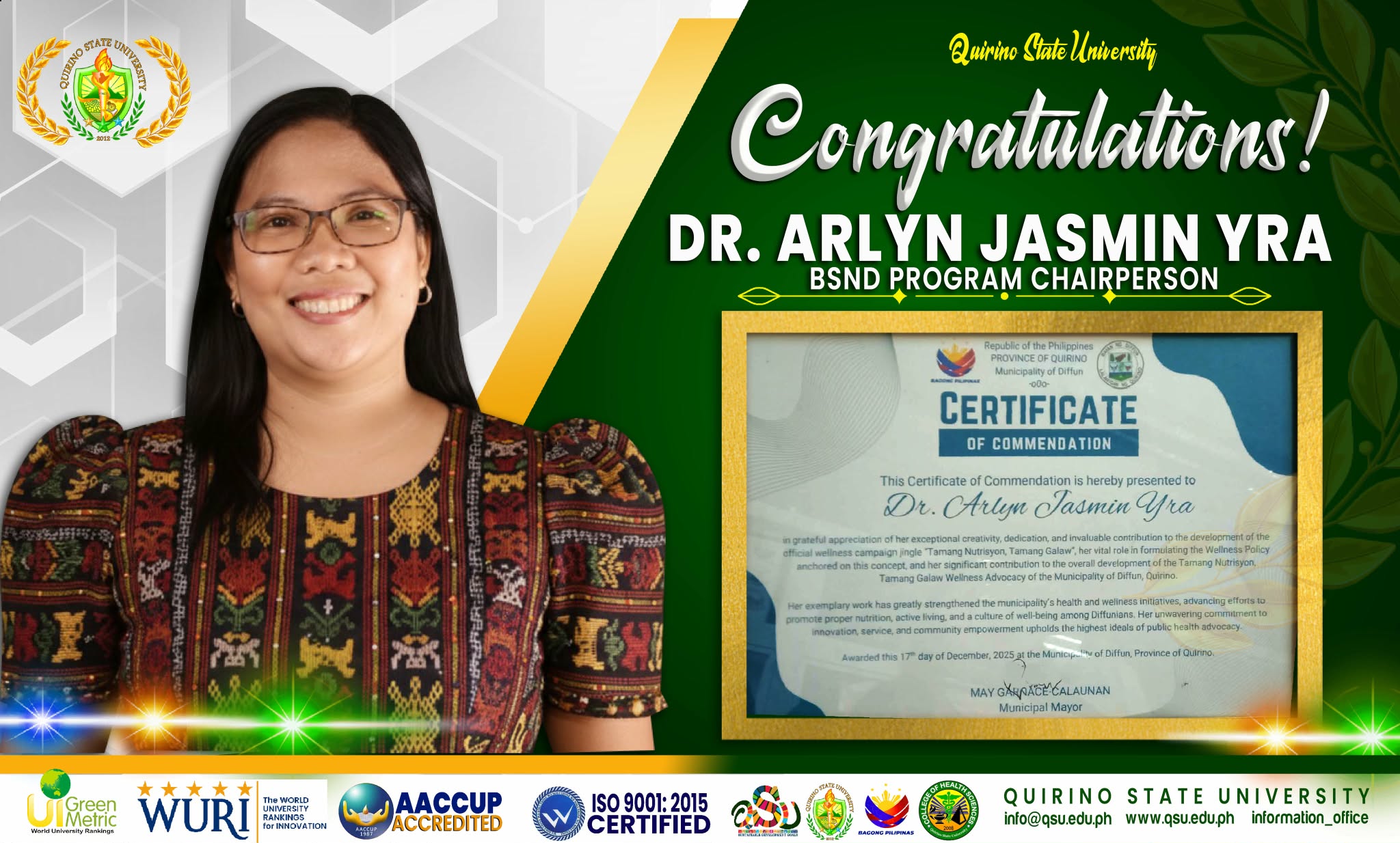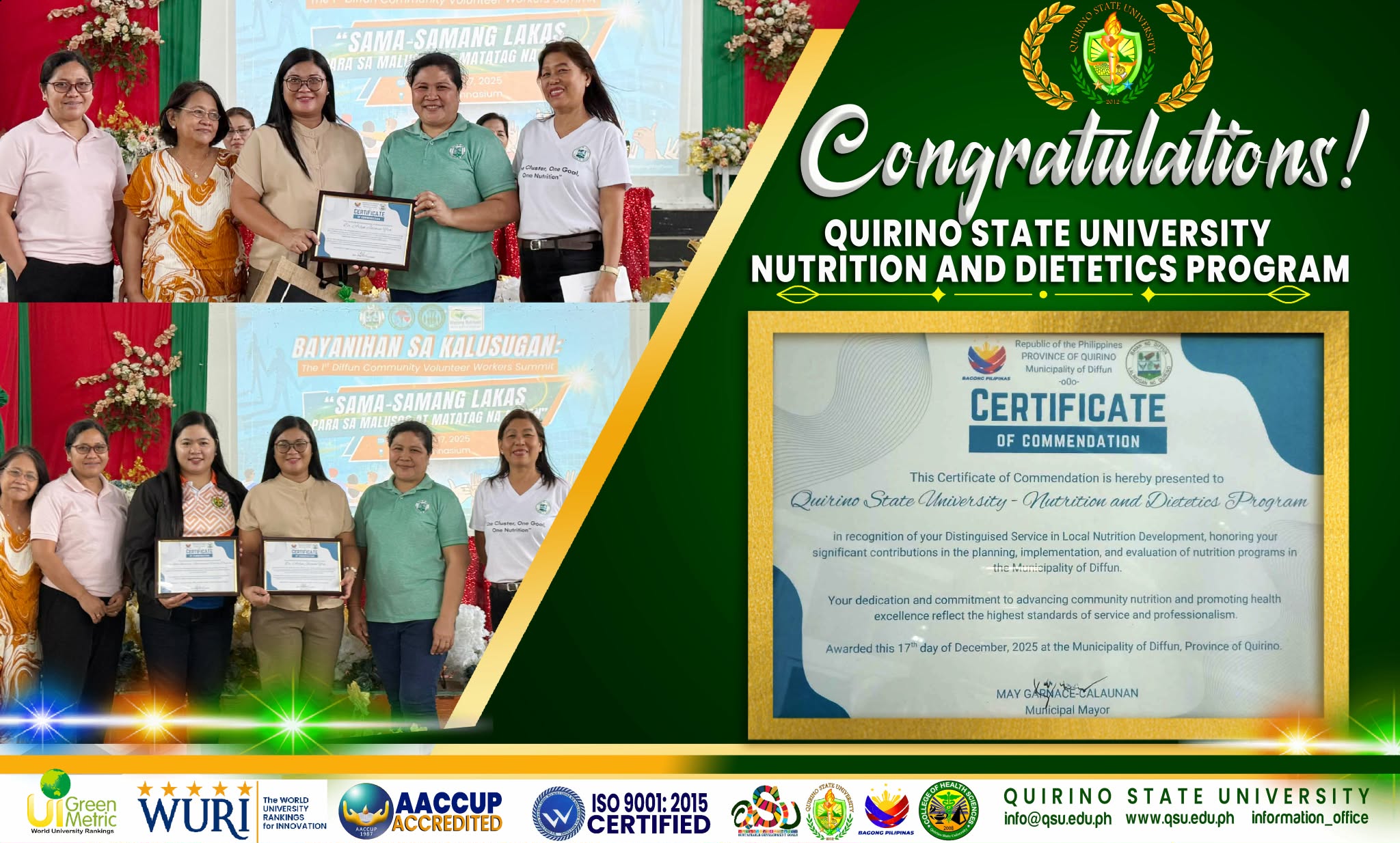 Beyond the laboratory, the programโs commitment to public service was honored on December 12, 2025, during the “Bayanihan sa Kalusugan: The First Diffun Community Volunteer Workers Summit.” The BSND Extension Services received a Certificate of Commendation for its sustained and impactful work in the Municipality of Diffun. Through the NutriFIED C Program and a strong partnership with the Local Government Unit, the institution has implemented community-responsive interventions ranging from maternal and infant nutrition support to food safety promotion and local nutrition governance.