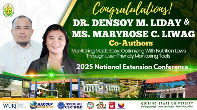 The University community warmly congratulates Dr. Arlyn J. Yra for winning the Best Presenter Award at the recent conference! This significant recognition reflects her expertise and leadership in developing pioneering, community-responsive tools that advance nutrition governance. We also extend our sincerest congratulations to all co-authorsโMs. Maryrose C. Liwag, Dr. Denson M. Liday, Ms. Isabel F. Salvador, Mr. Gerome B. Taguiam, and Ms. Mylene V. Bulongโwhose collective work fuels the Universityโs efforts to excellence, innovation, and public service. Their achievements bring great pride to the institution and demonstrates the powerful impact of our extension work on national public health goals.