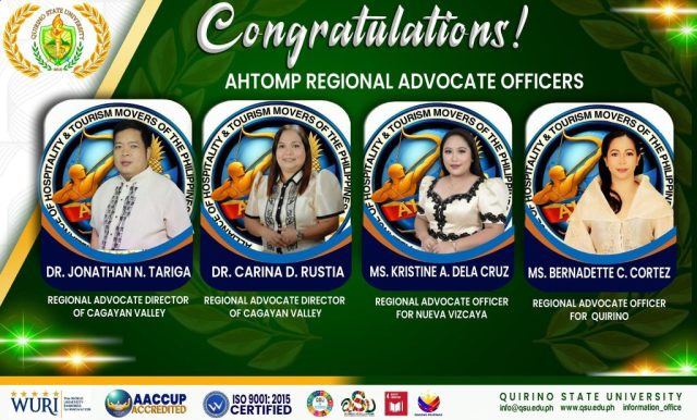 Beyond the awards, education leaders were appointed to significant roles within the organization. Prof. Jonathan N. Tariga, Program Chairperson of the CHTM-Diffun Campus, and Dr. Carina D. Rustia, Program Chairperson of the BSHM-Cabarroguis Campus, were named Regional Advocate Directors of Cagayan Valley. Concurrently, Ms. Kristine A. Dela Cruz and Ms. Bernadette C. Cortez were appointed as Regional Advocate Officers for Quirino.