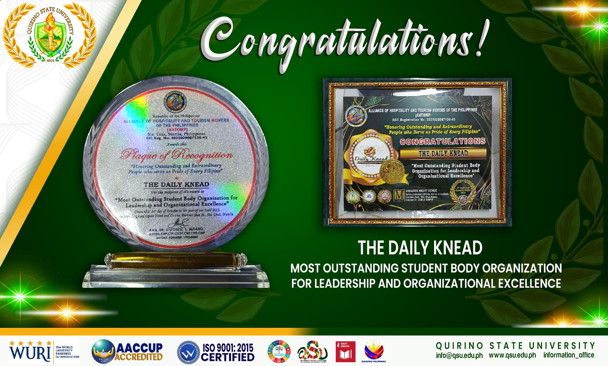 Furthermore, the Universityβs student organization, βThe Daily Knead,β was named the Most Outstanding Student Body Organization for Leadership and Organizational Excellence.