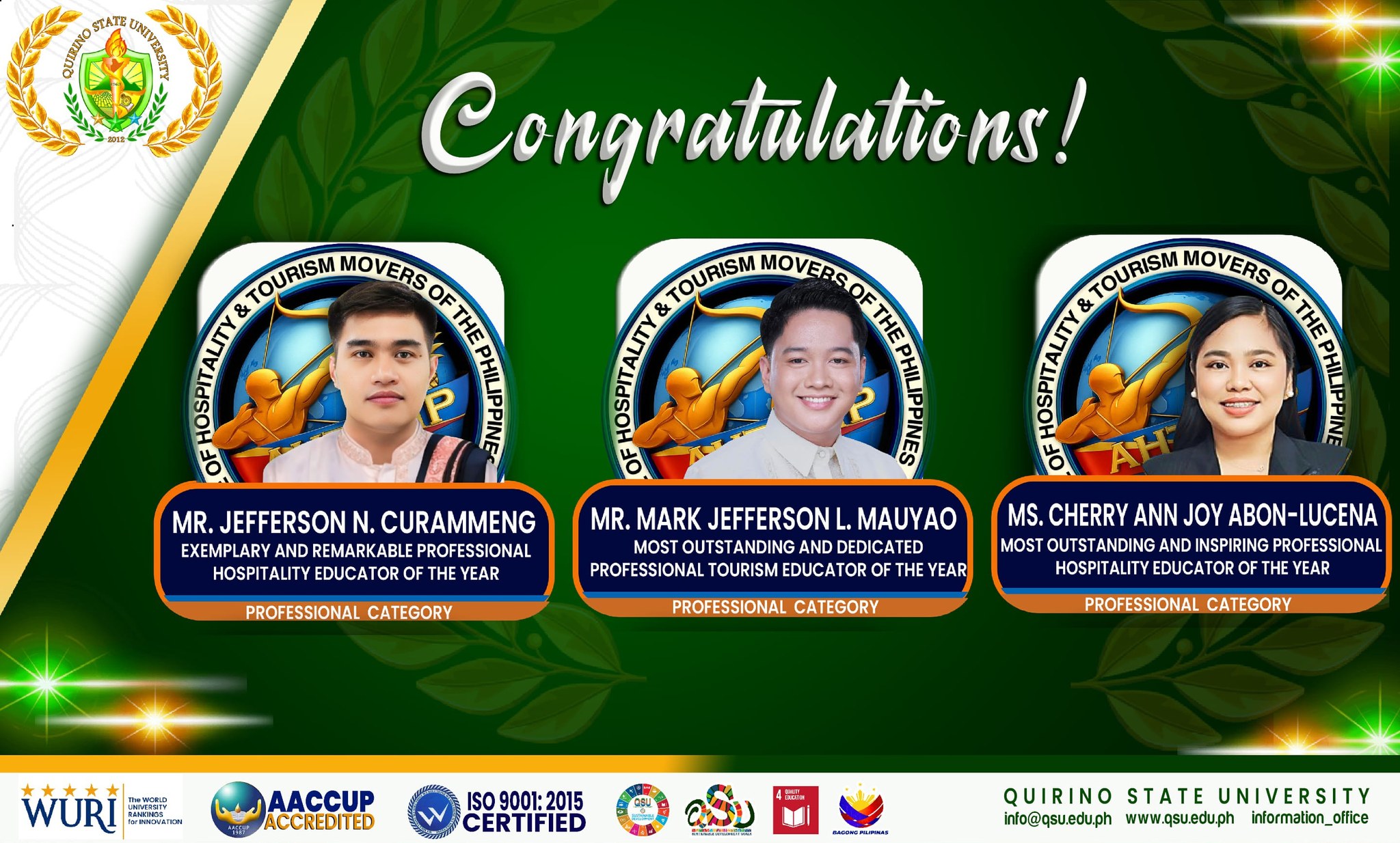 Moreover, several faculty members were also awarded for their exemplary performance as educators in the field of hospitality and tourism: Ms. Rachel B. Nucaza, Mr. Jefferson N. Curammeng, Mr. Mark Jefferson L. Mauyao, and Ms. Cherry Joy Abon-Lucena.