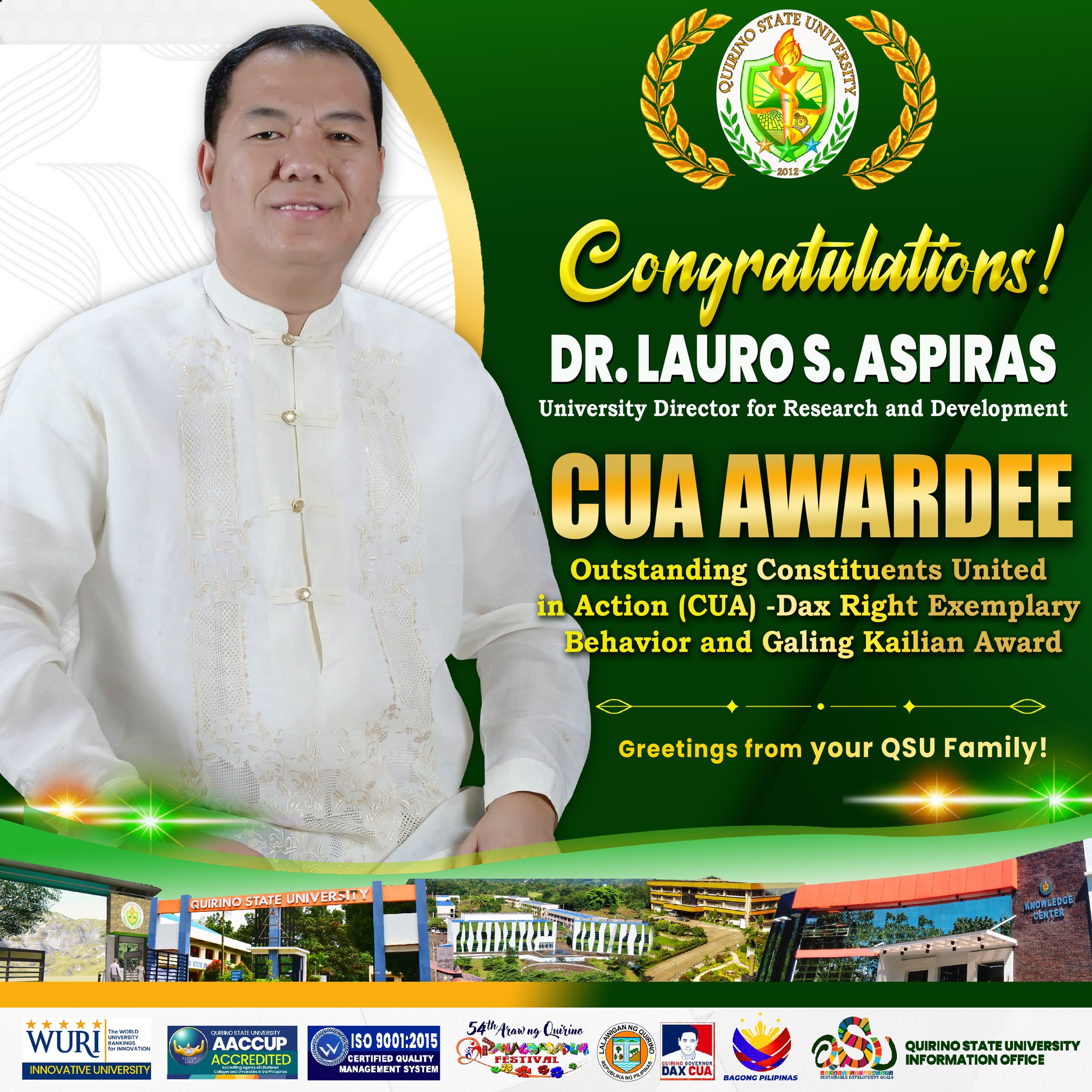 Dr. Lauro S. Aspiras, the University Director for Research and Development and Chairperson of the Master of Arts in Education, was recently honored as one of ten recipients of the Outstanding Constituents United in Action (CUA)โ€” Dax Right Exemplary Behavior and Galing Kailian Award. The recognition acknowledges his contributions that have brought honor and prestige to the province.