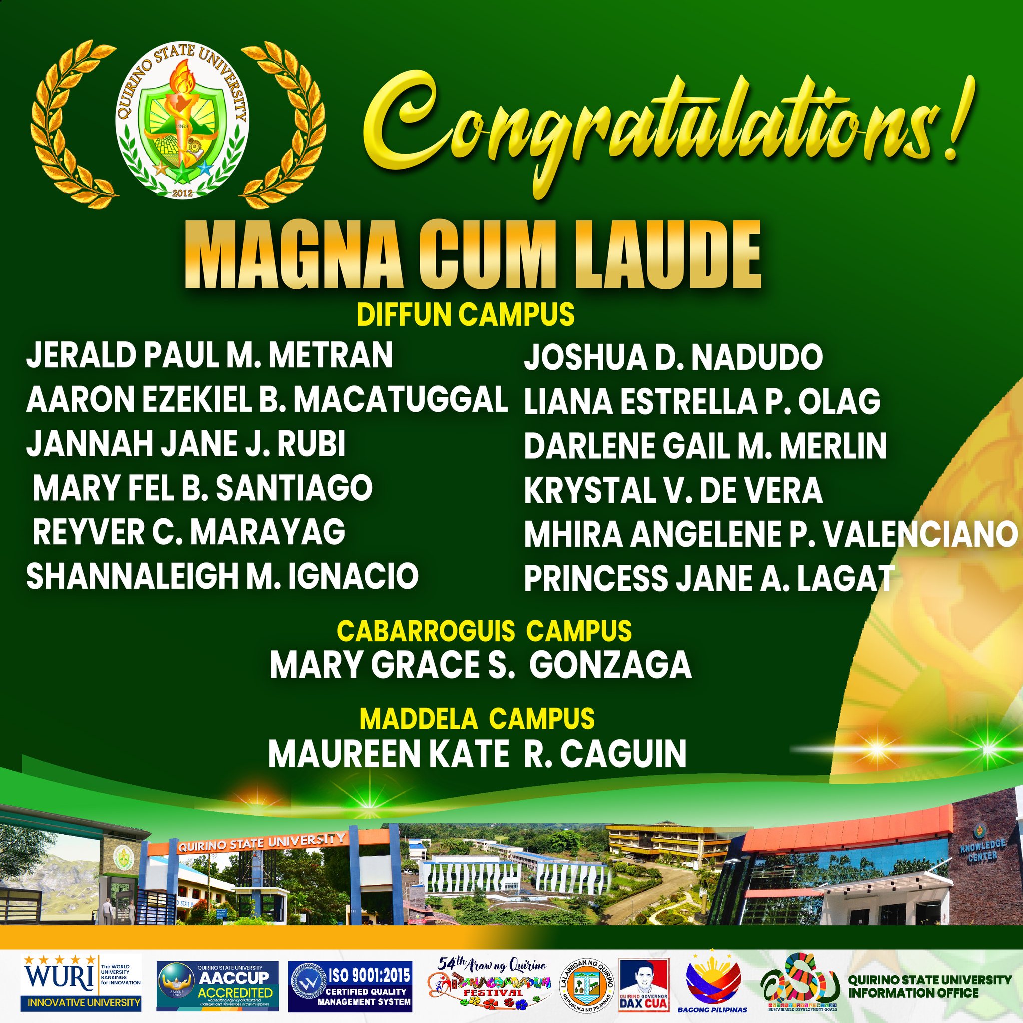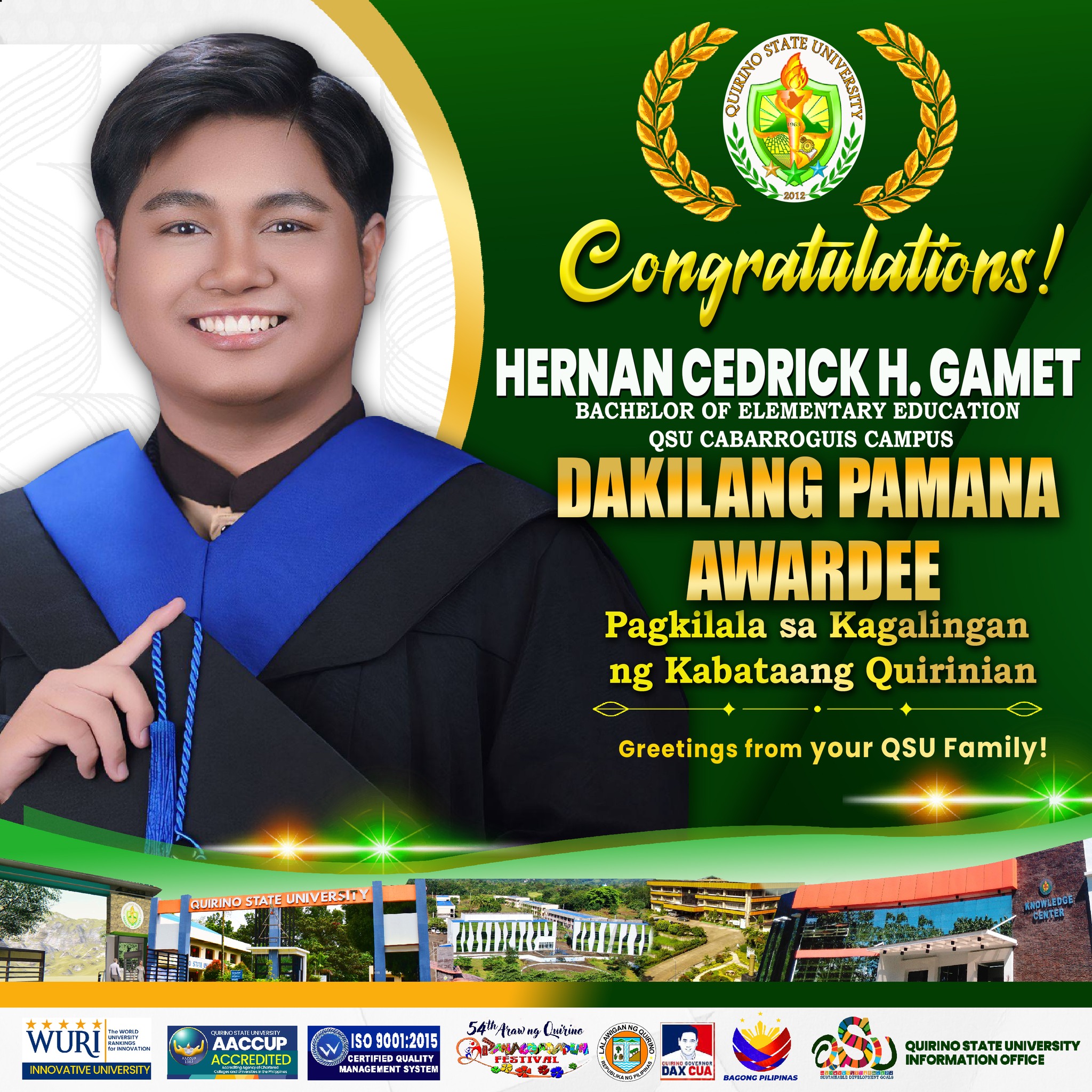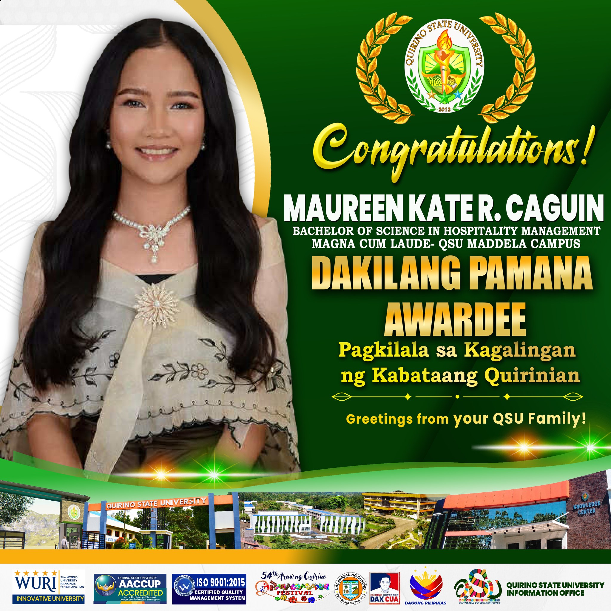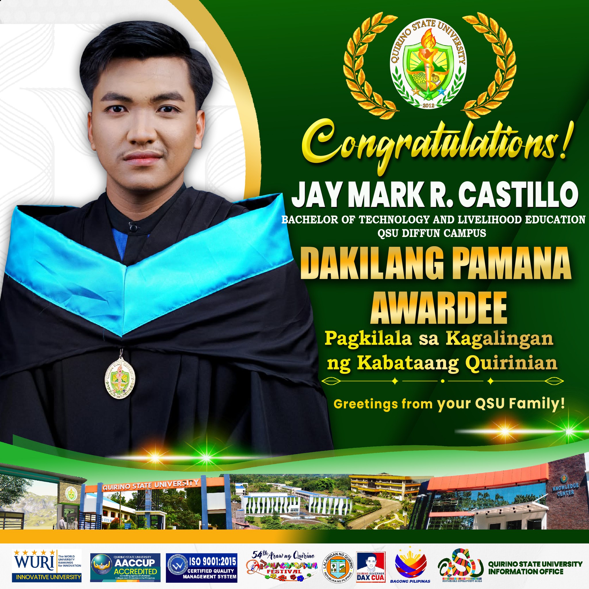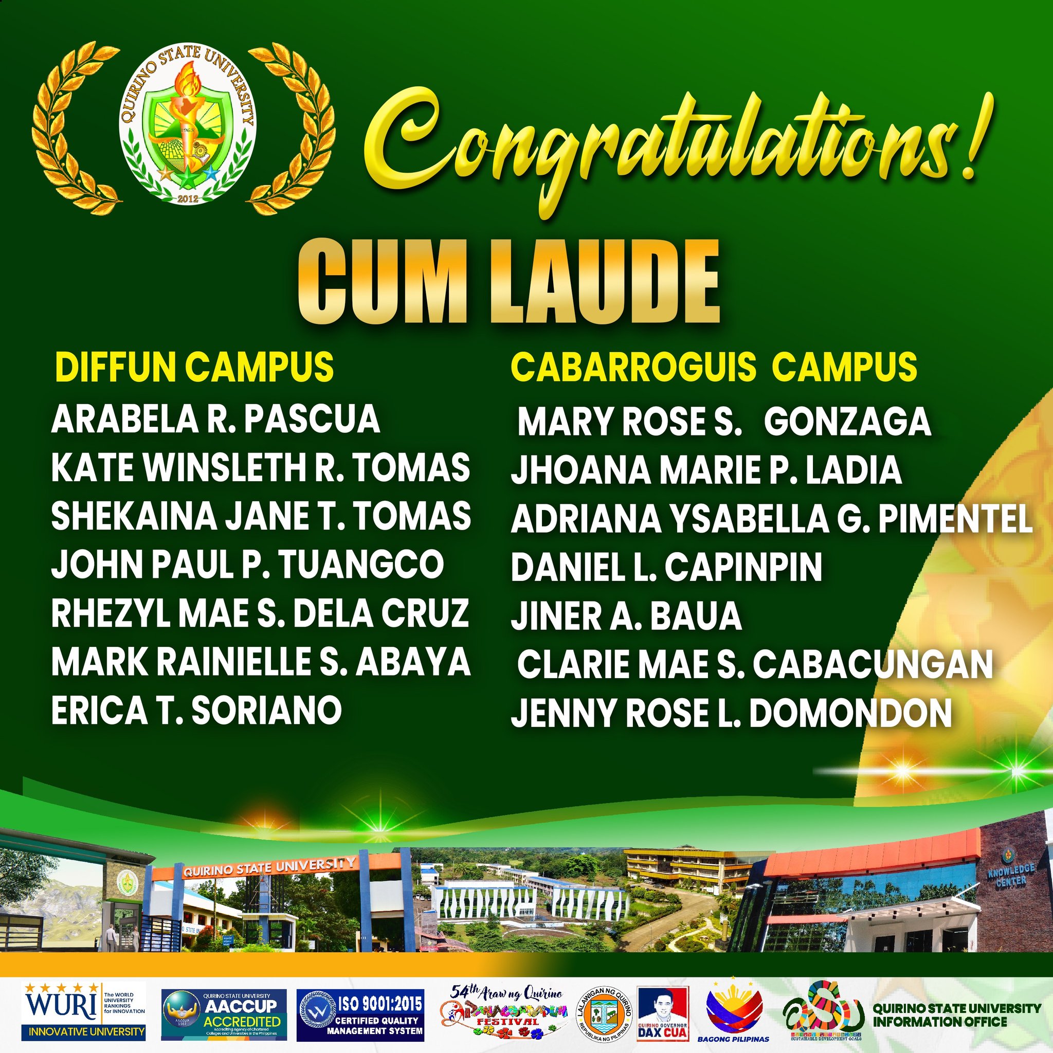 Quirinian graduates from the three campuses with Latin honors were also recognized this year under โ€œPagkilala sa Kagalingan ng Kabataang Quirinian.โ€ They were among the 104 outstanding honorees from various colleges and universities in the country who joined the awarding ceremony. The event was held at the Provincial Gymnasium on September 6, 2025, during the 54th Araw ng Quirino and Panagdadapun Celebration.